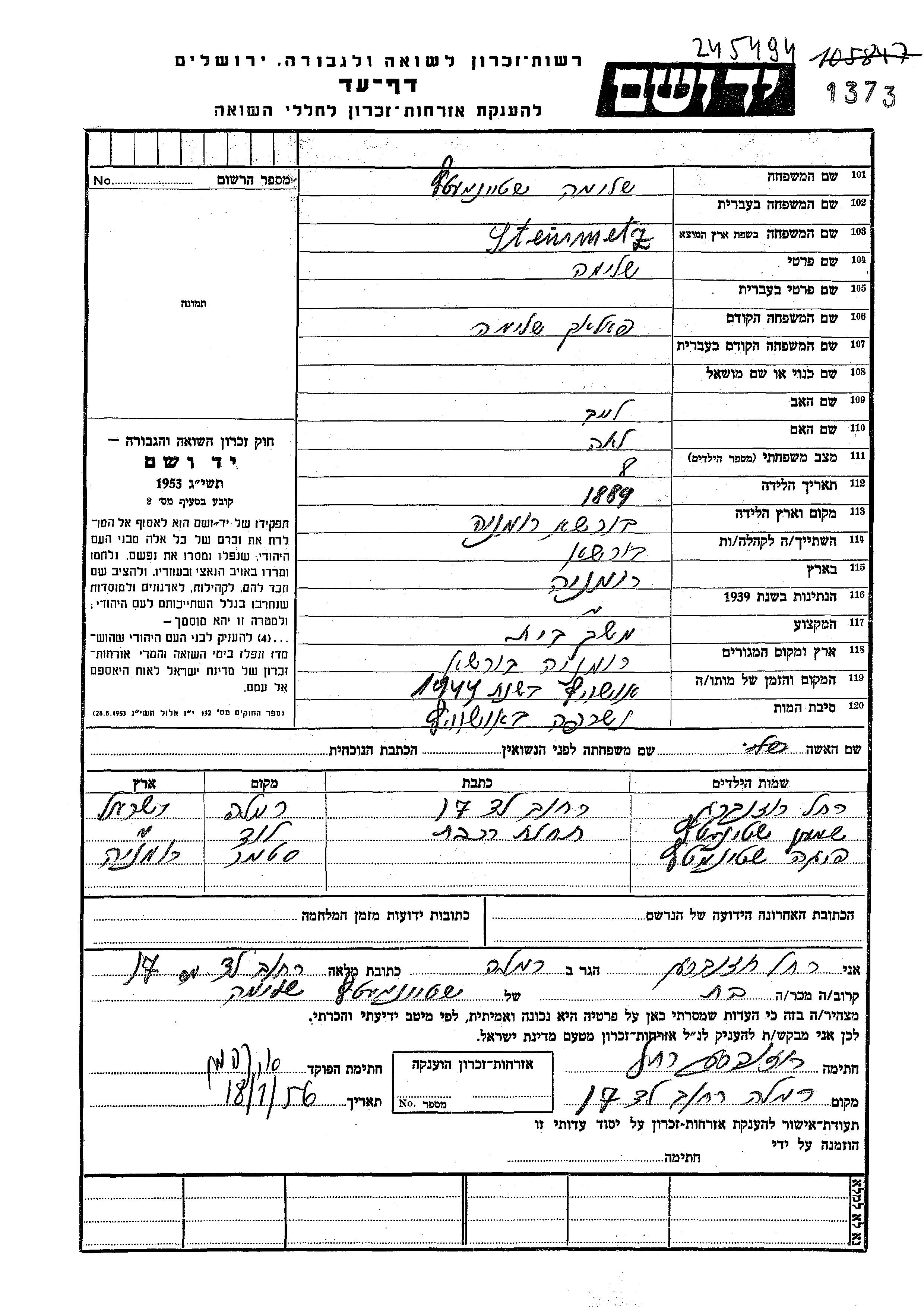 Yad Vashem - Pages of Testimony Names Memorial Collection