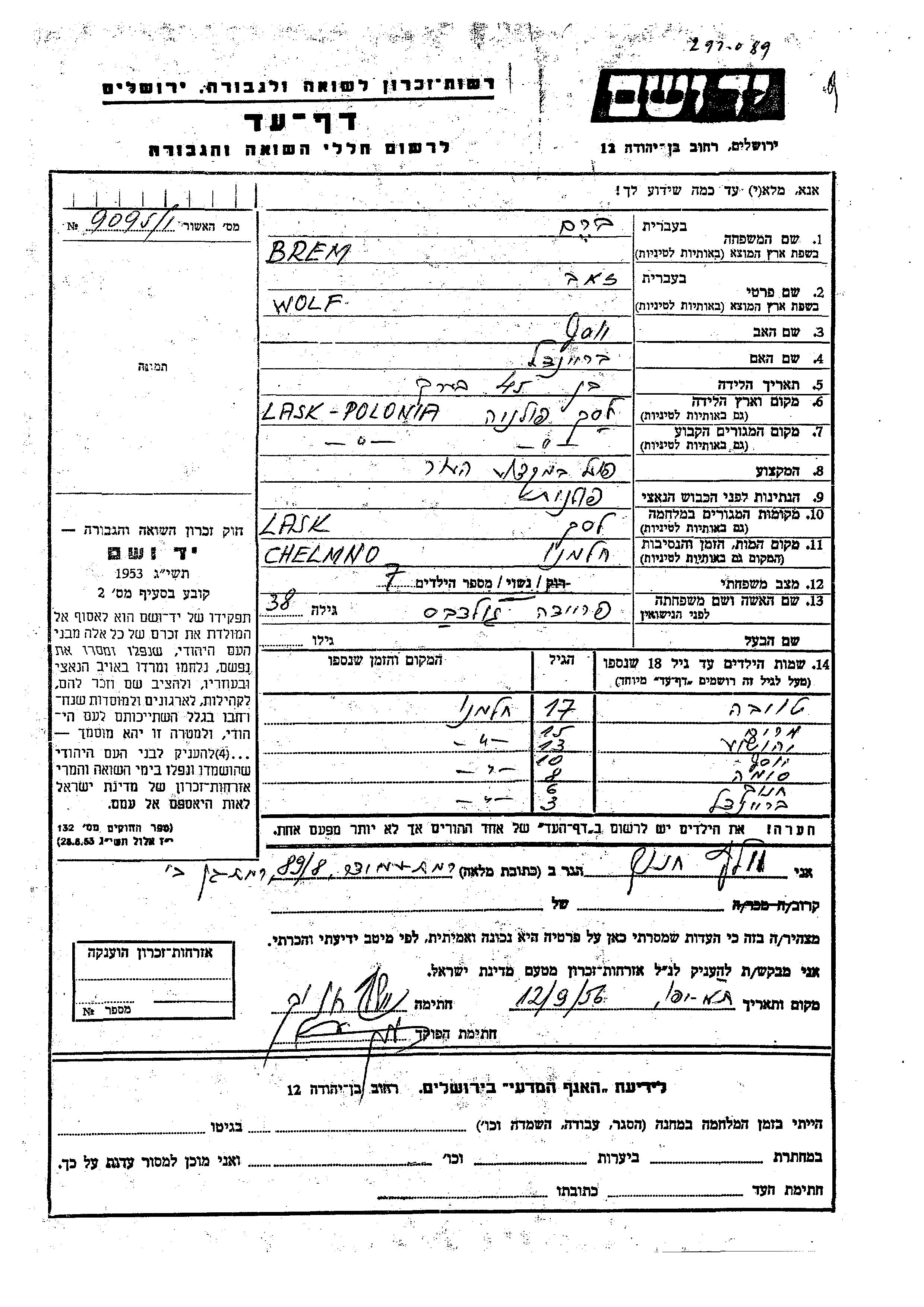 Brem Khanokh Lask, Pologne Feuille de témoignage