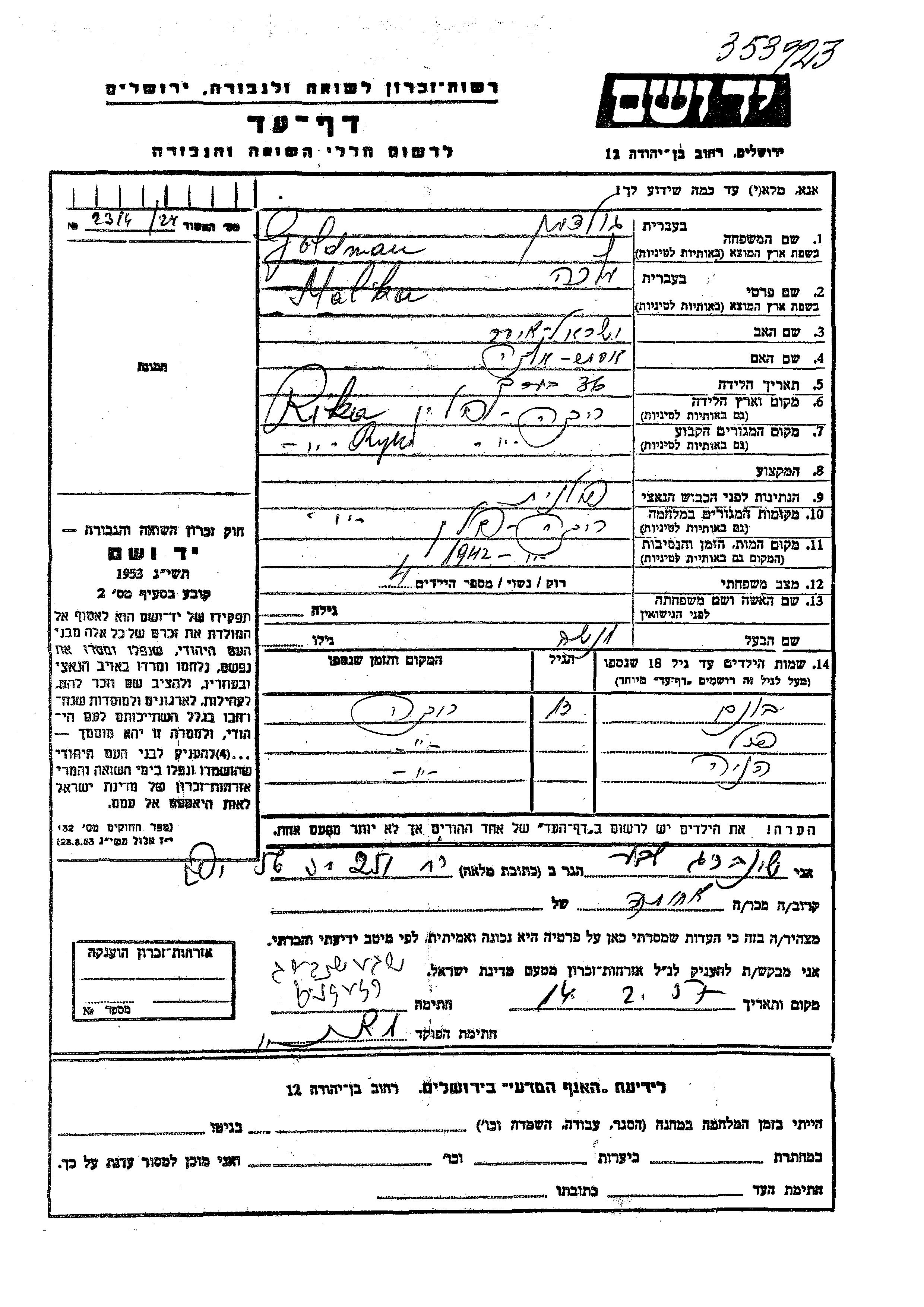 Yad Vashem - Pages of Testimony Names Memorial Collection