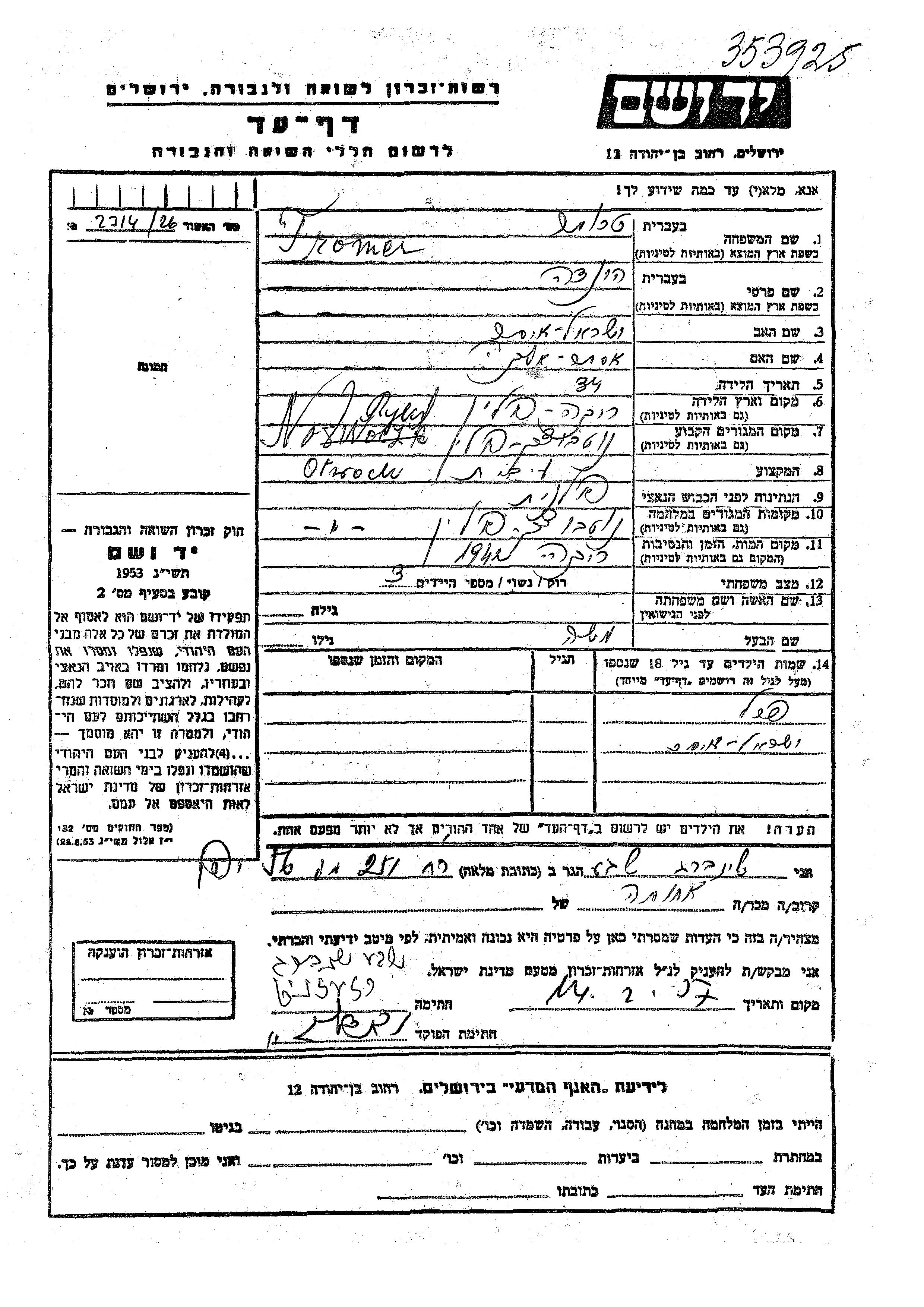 Yad Vashem - Pages of Testimony Names Memorial Collection