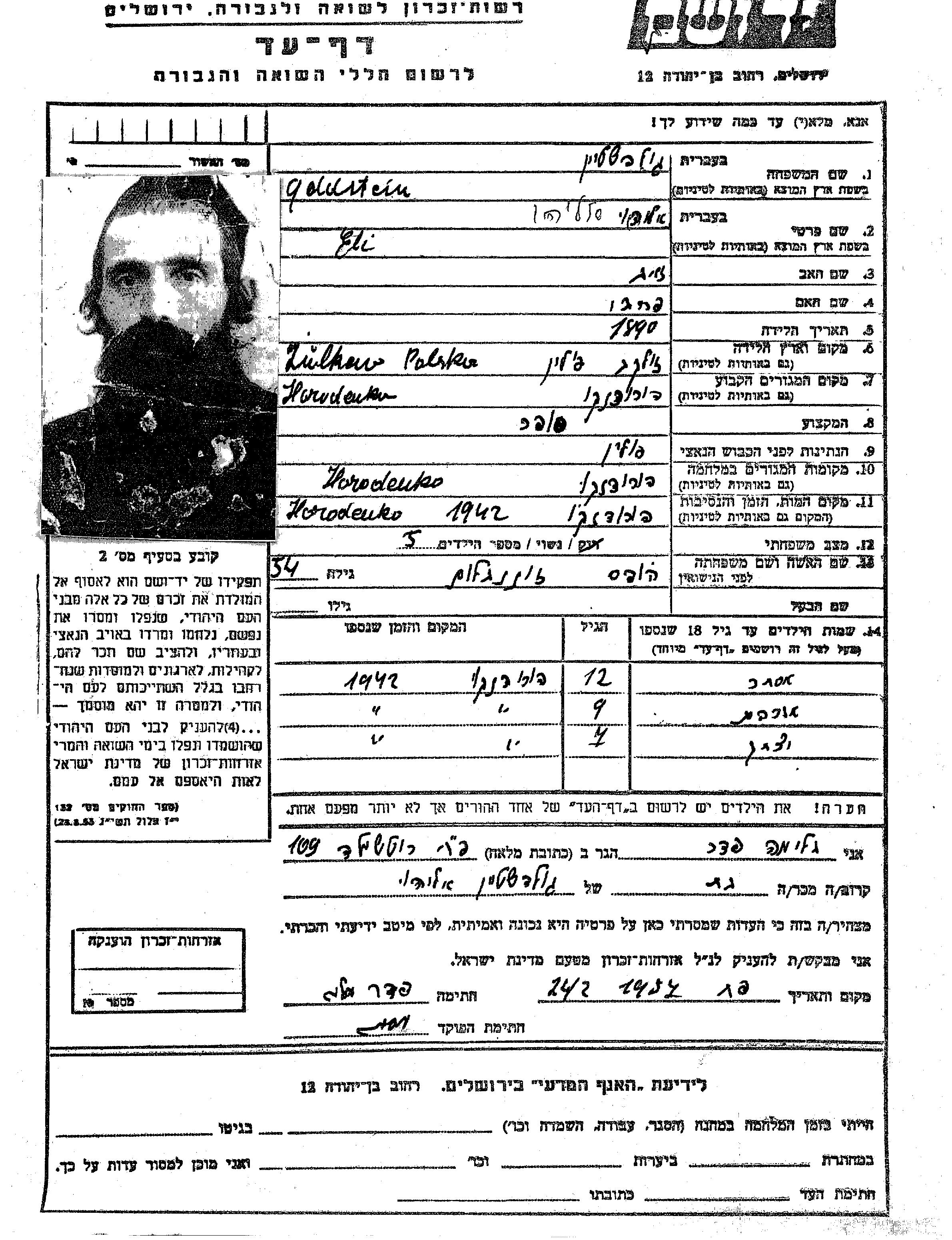 Goldstein Ora Horodenka, Pologne Feuille de témoignage