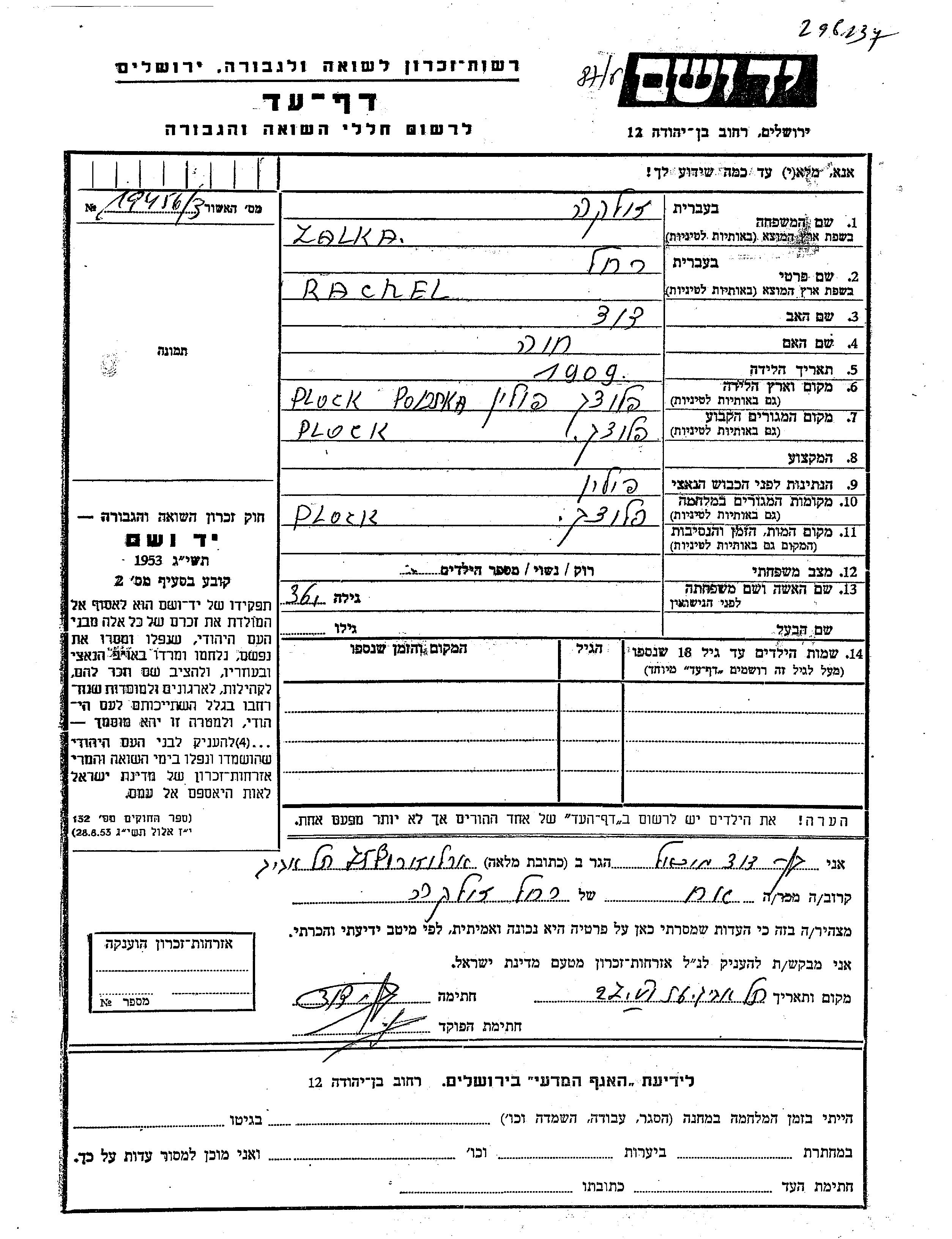 Zalka Rachel 1909 Plock, Pologne Feuille de témoignage