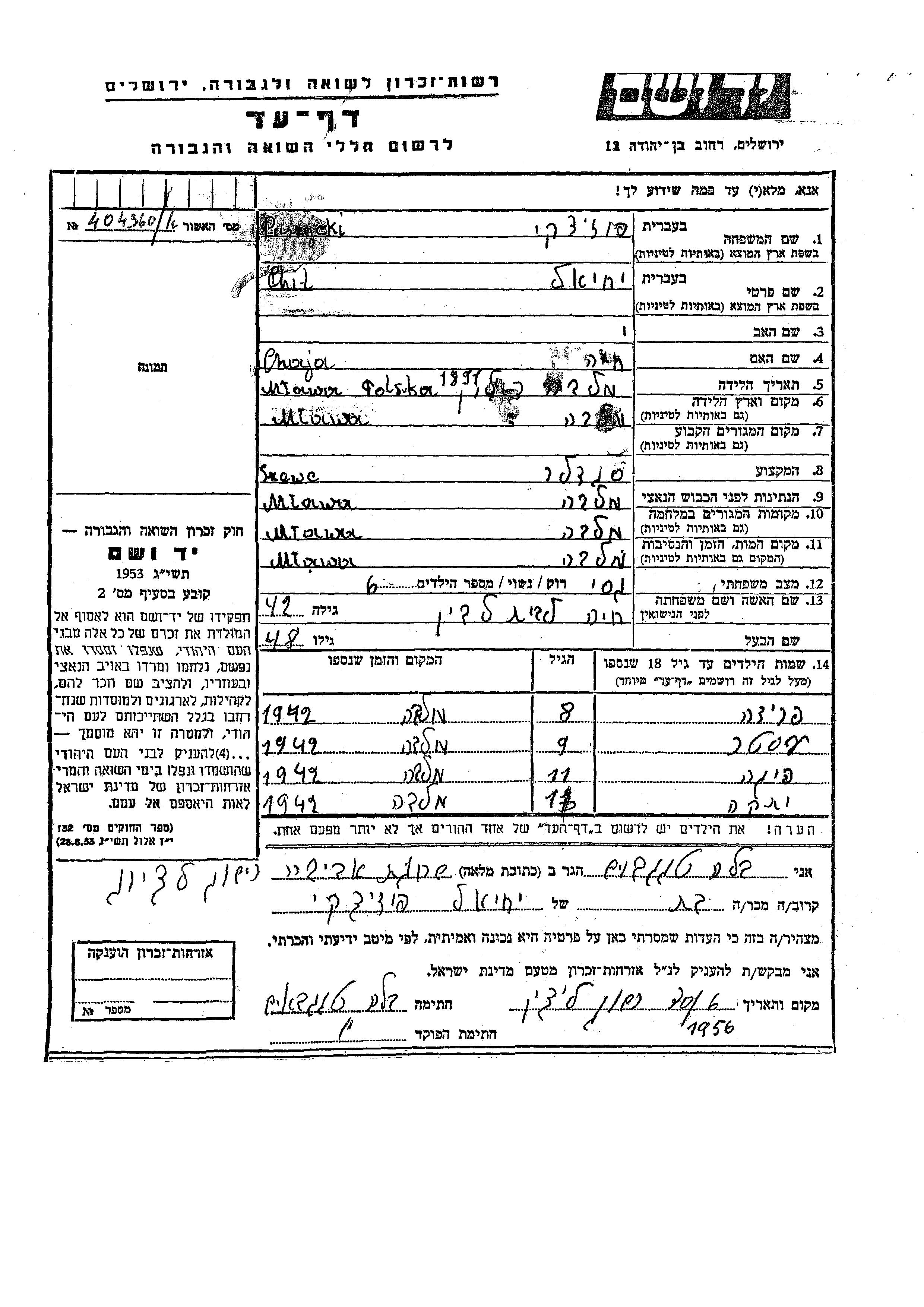 Puzitzki Yehudit endroit inconnu, Feuille de témoignage