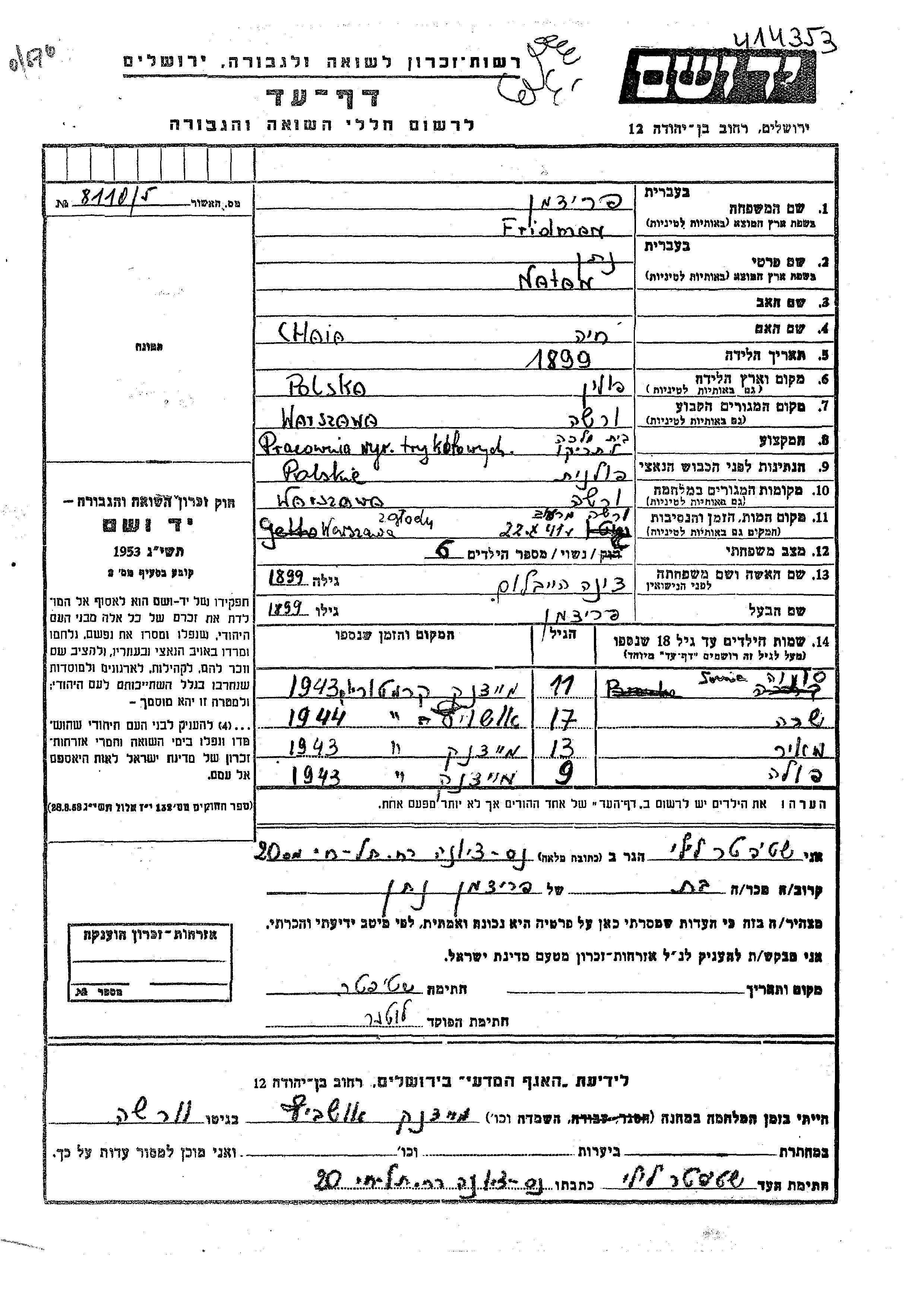 Fridman Meir Warsaw, Pologne Feuille de témoignage