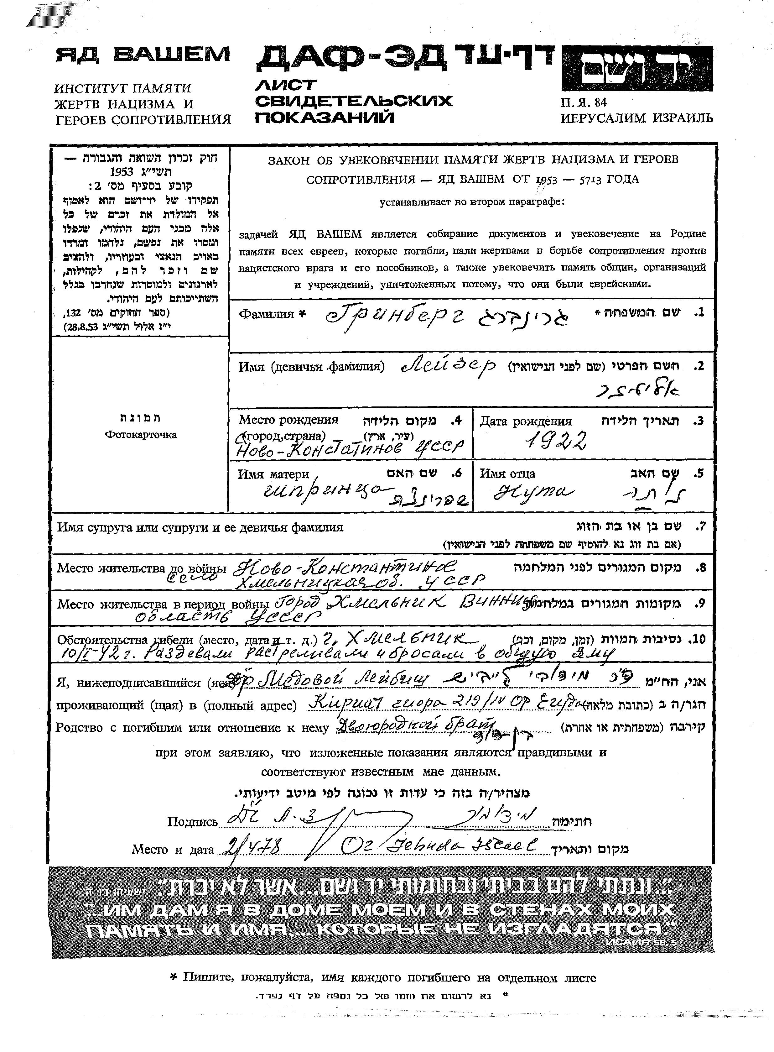 Grinberg Eliezer 1922 Novokonstantinov, Ukraine (URSS) Feuille de témoignage