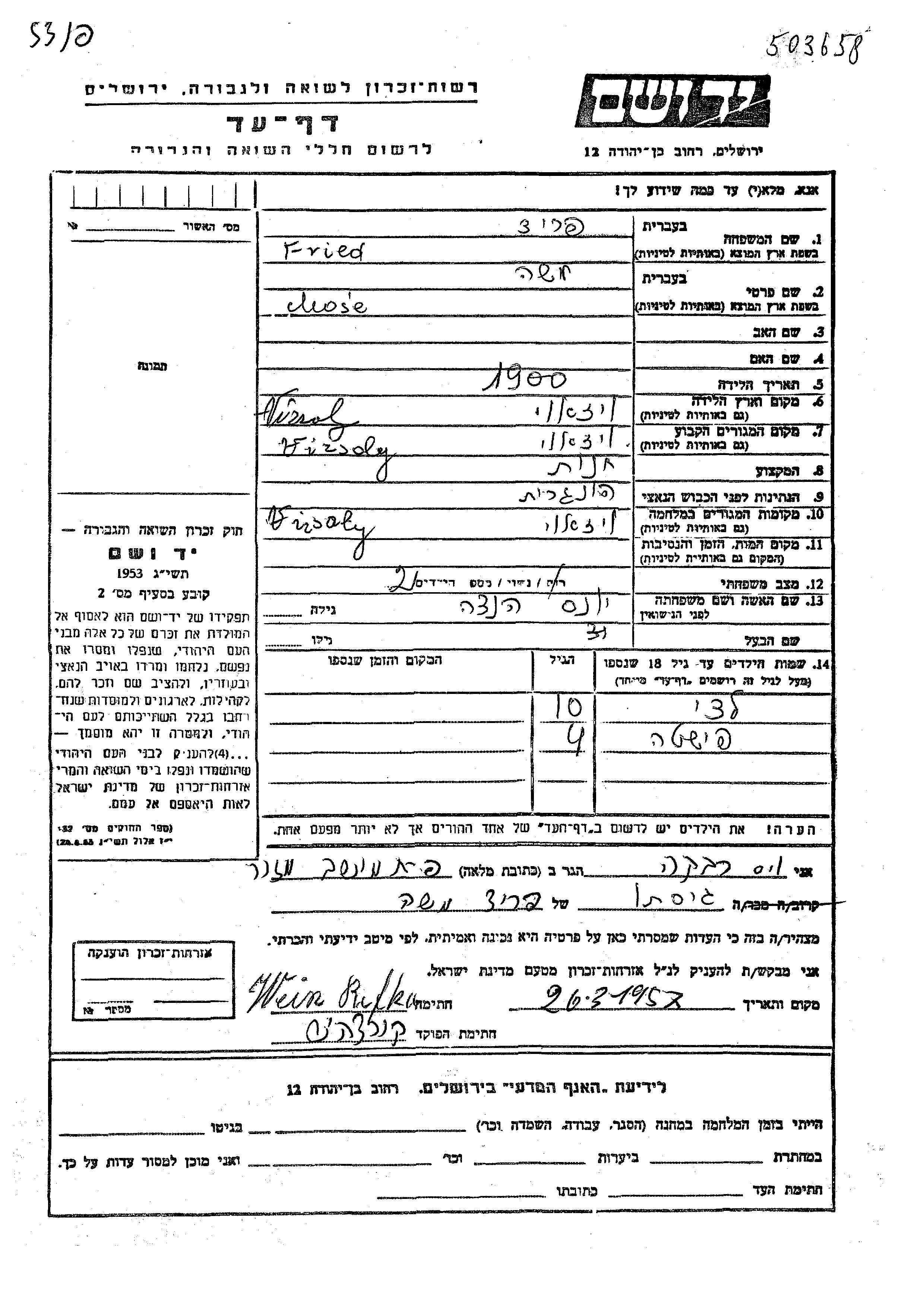 Yad Vashem - Pages of Testimony Names Memorial Collection