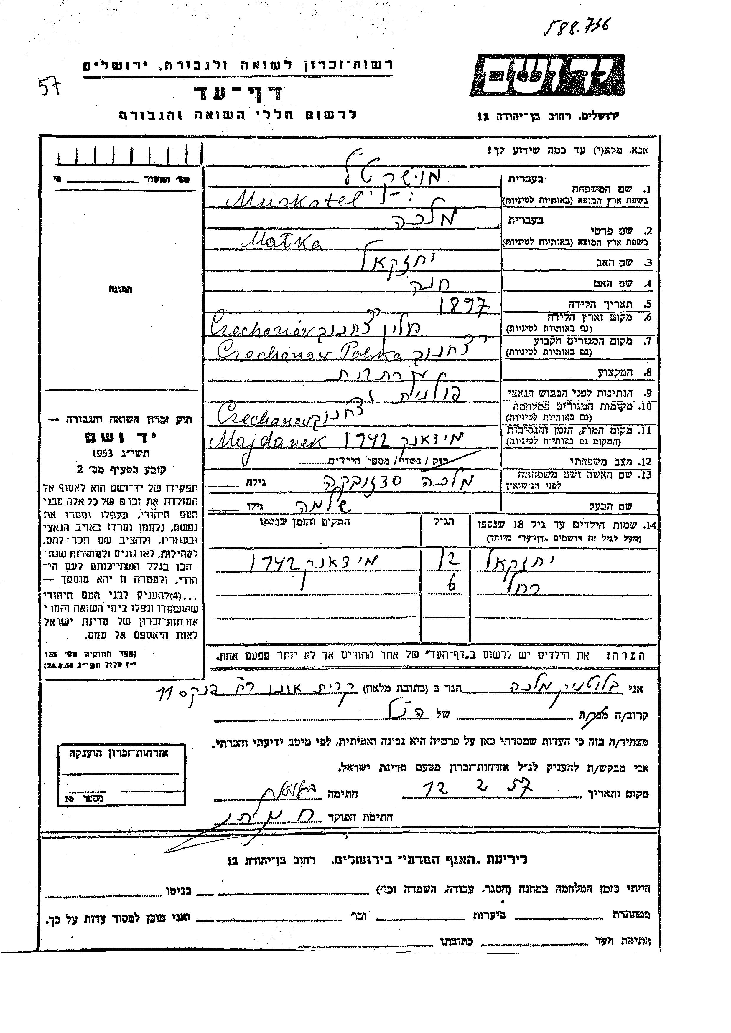 Yekhezkel Muskatel est né fils de Shlomo et de Malka née Sadzavki. Il était Enfant. Avant la seconde guerre mondiale il vivait à Czechanow, Pologne. Au cours de la guerre, il était à Czechanow, Pologne.