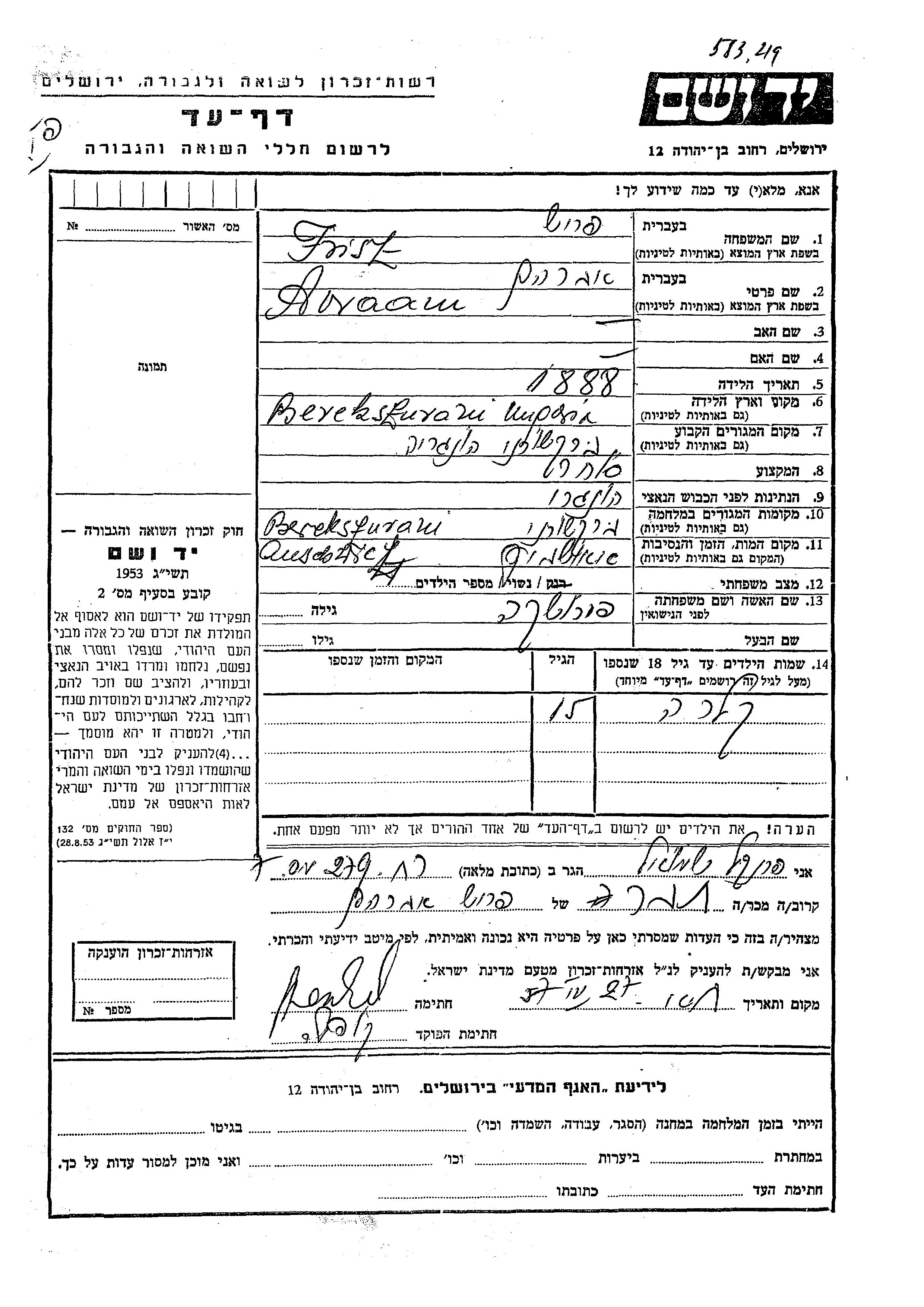 Yad Vashem - Pages of Testimony Names Memorial Collection