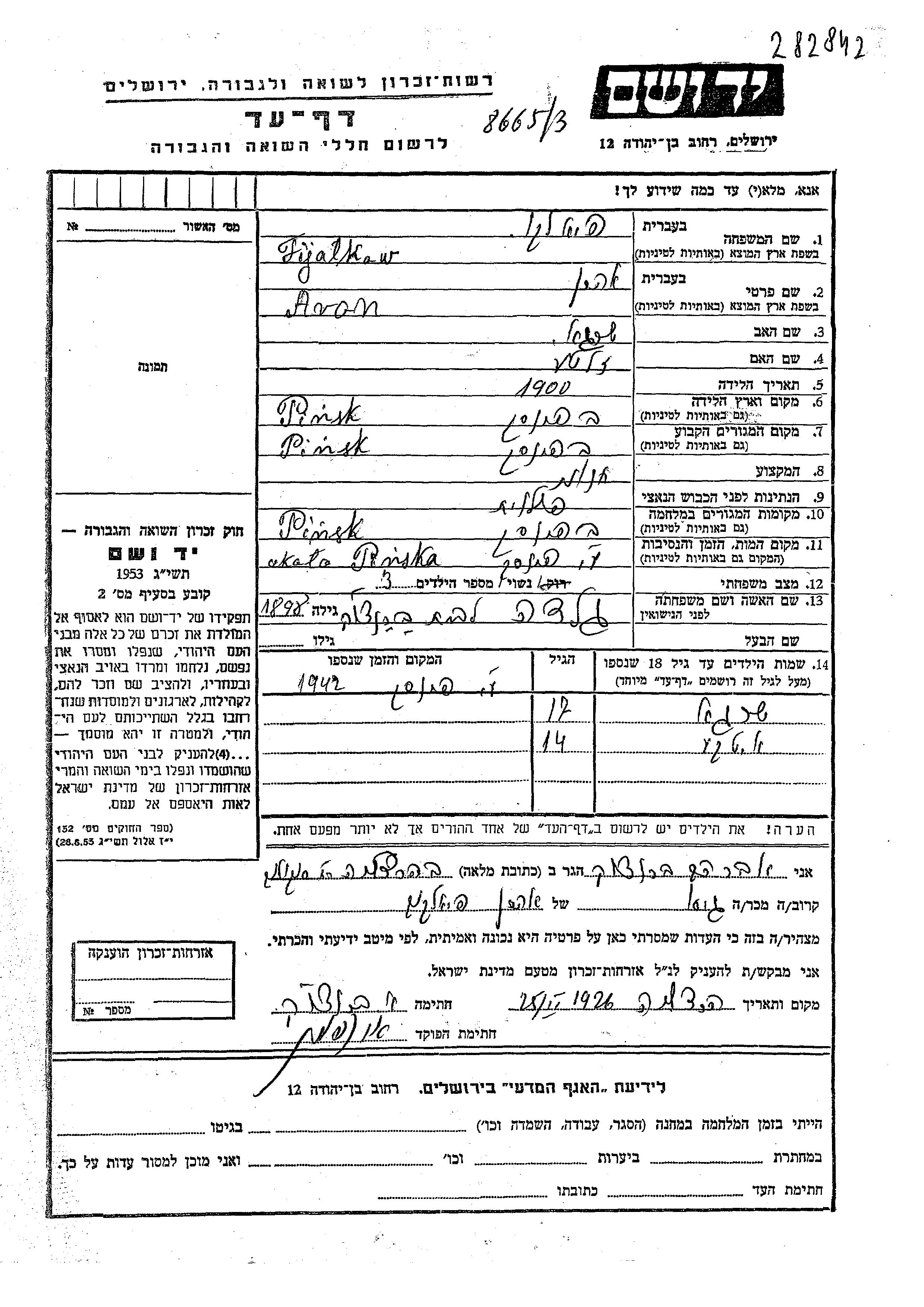 Fijalkow Fialko Yehudit Pinsk, Pologne Feuille de témoignage