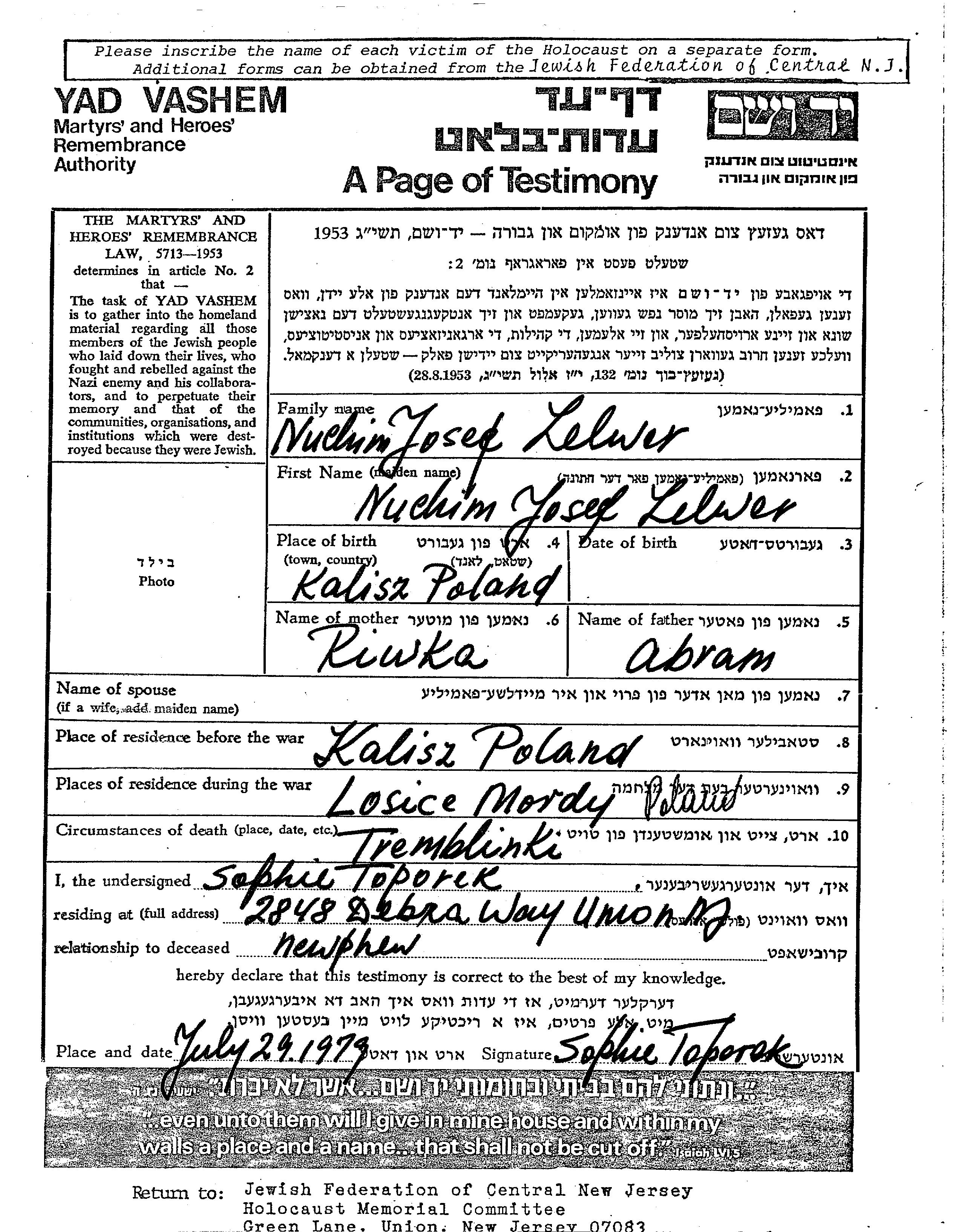 Zelwer Nuchim Josef Kalisz, Pologne Feuille de témoignage