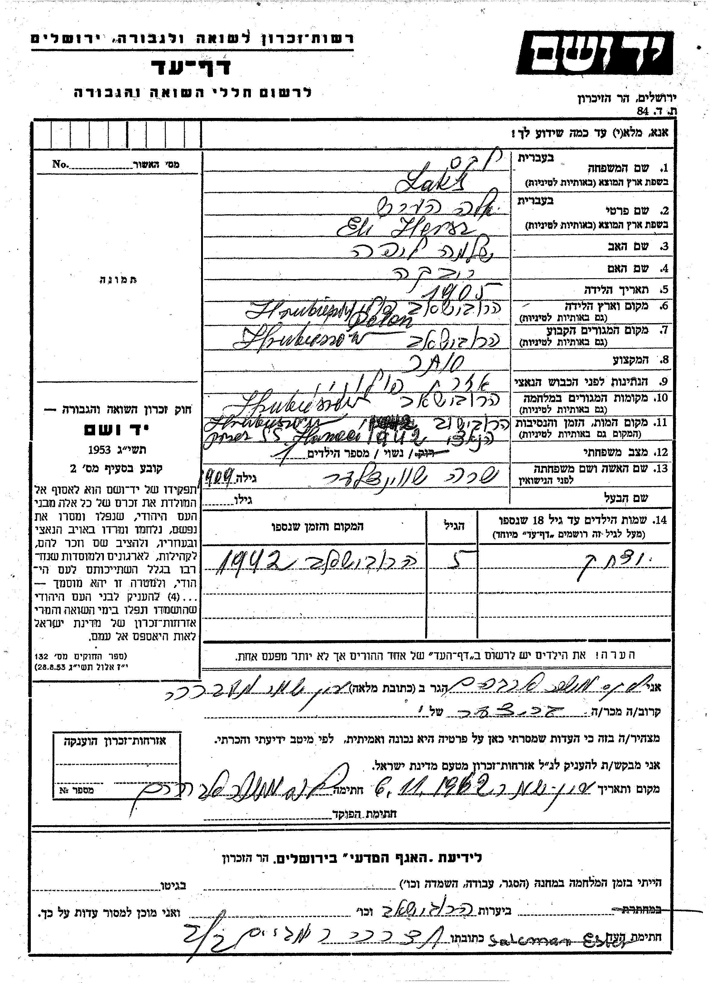 Laks Eli Hersz Ela 1905 Hrubieszow, Pologne Feuille de témoignage