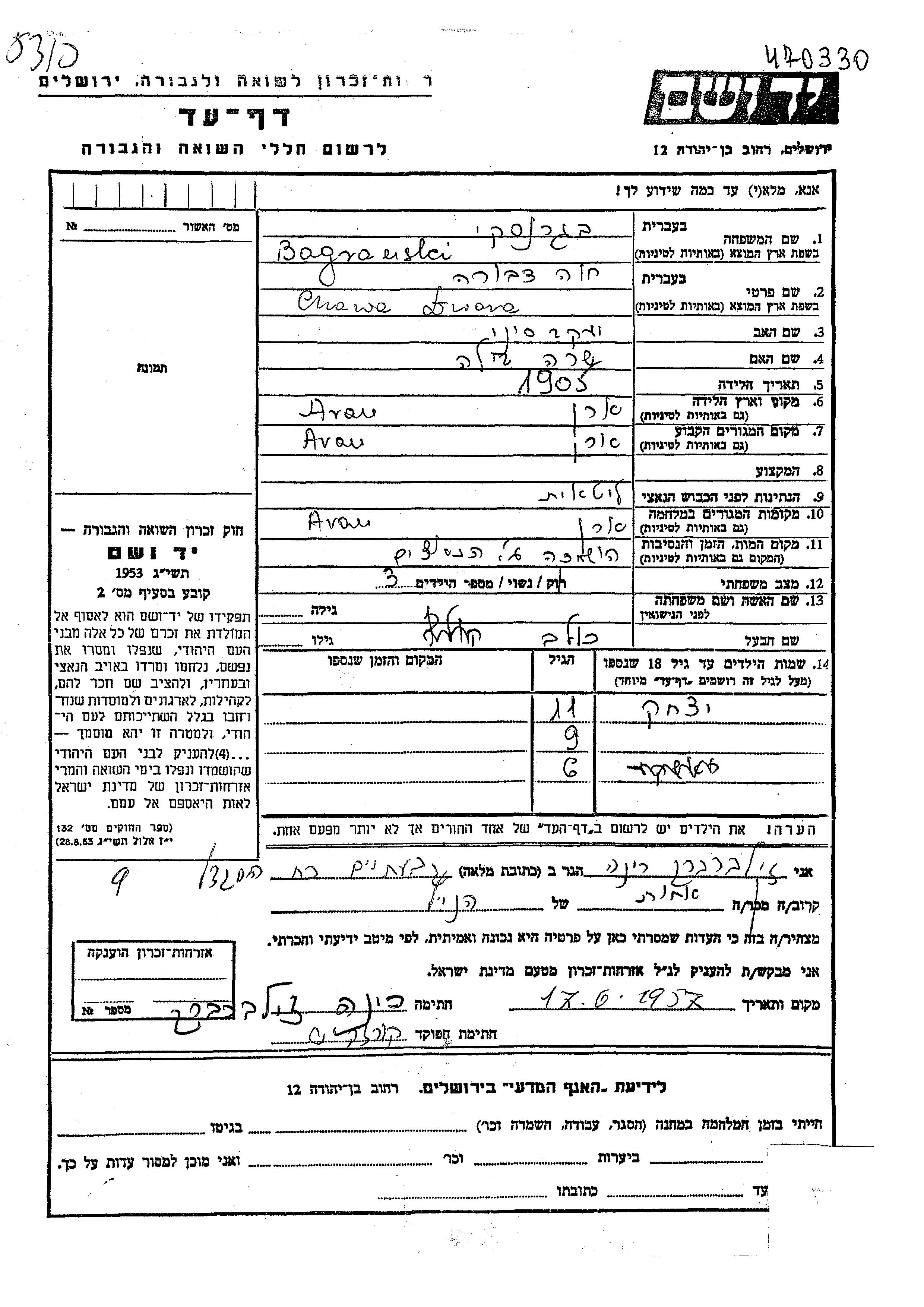 Bagranski prénom inconnu Aran, Pologne Feuille de témoignage