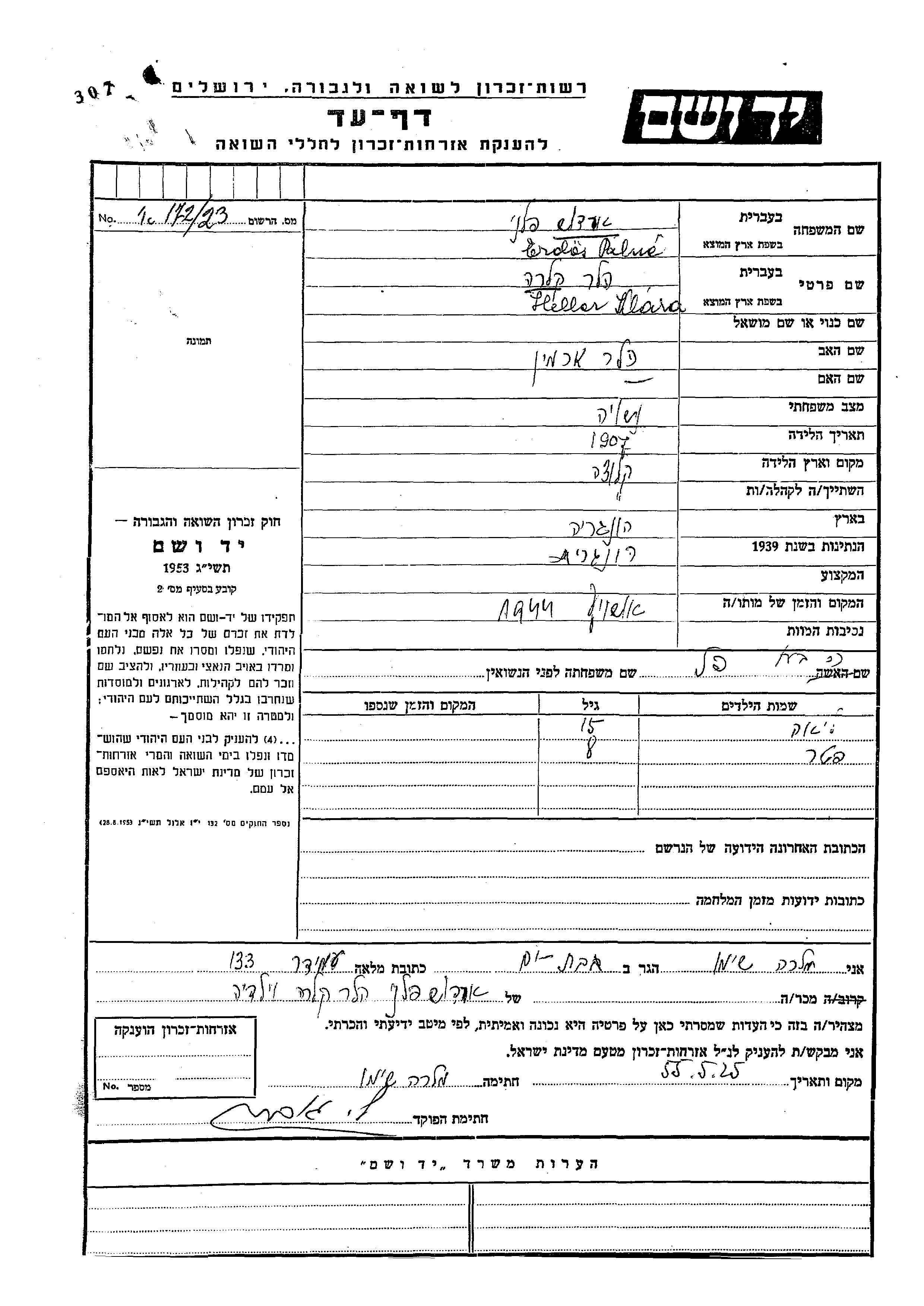 Yad Vashem - Pages of Testimony Names Memorial Collection