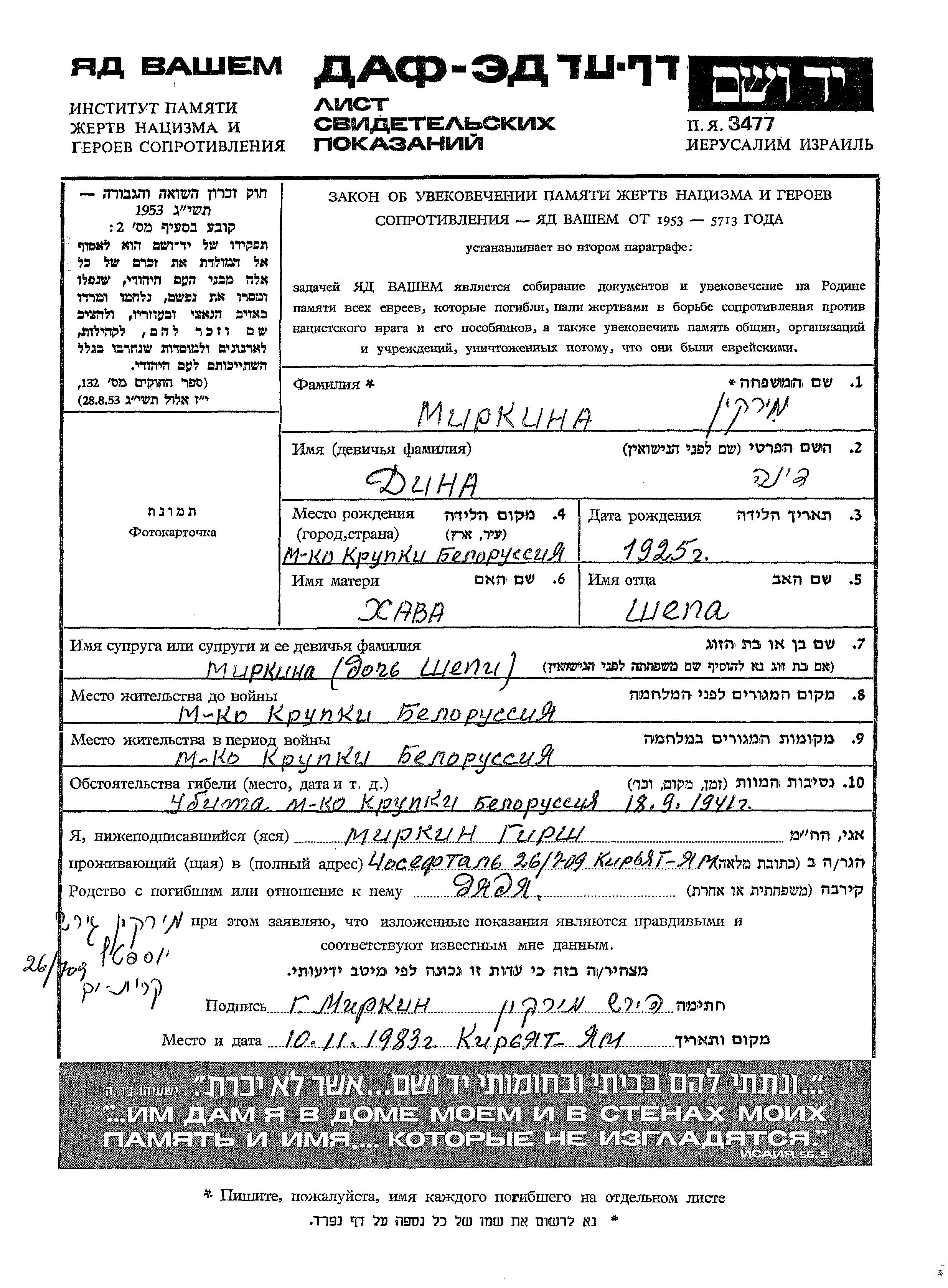 Mirkin Dina 1925 Krupki, Bélorussie (URSS) Feuille de témoignage