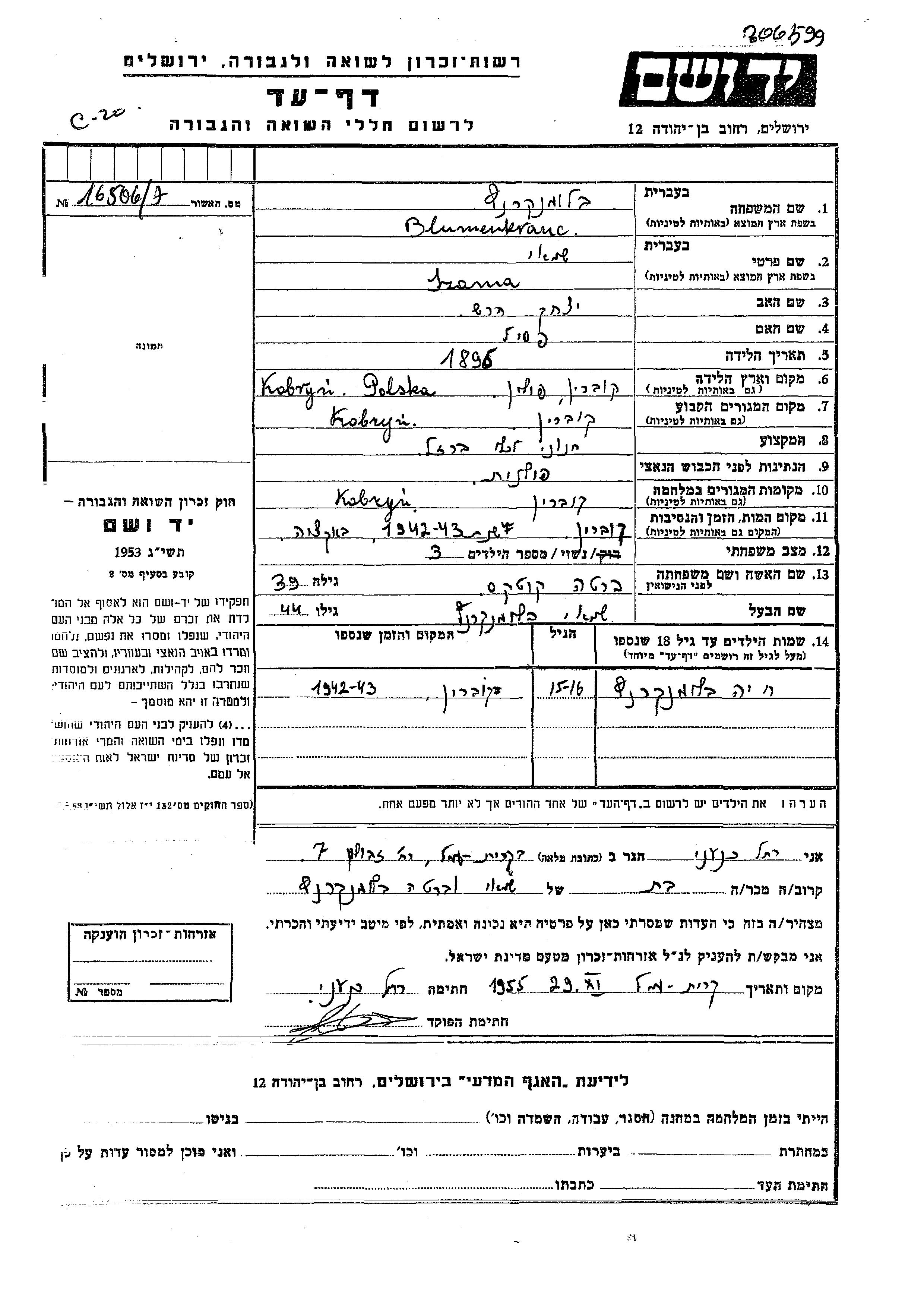 Blumenkranc Khaia Kobryn, Pologne Feuille de témoignage