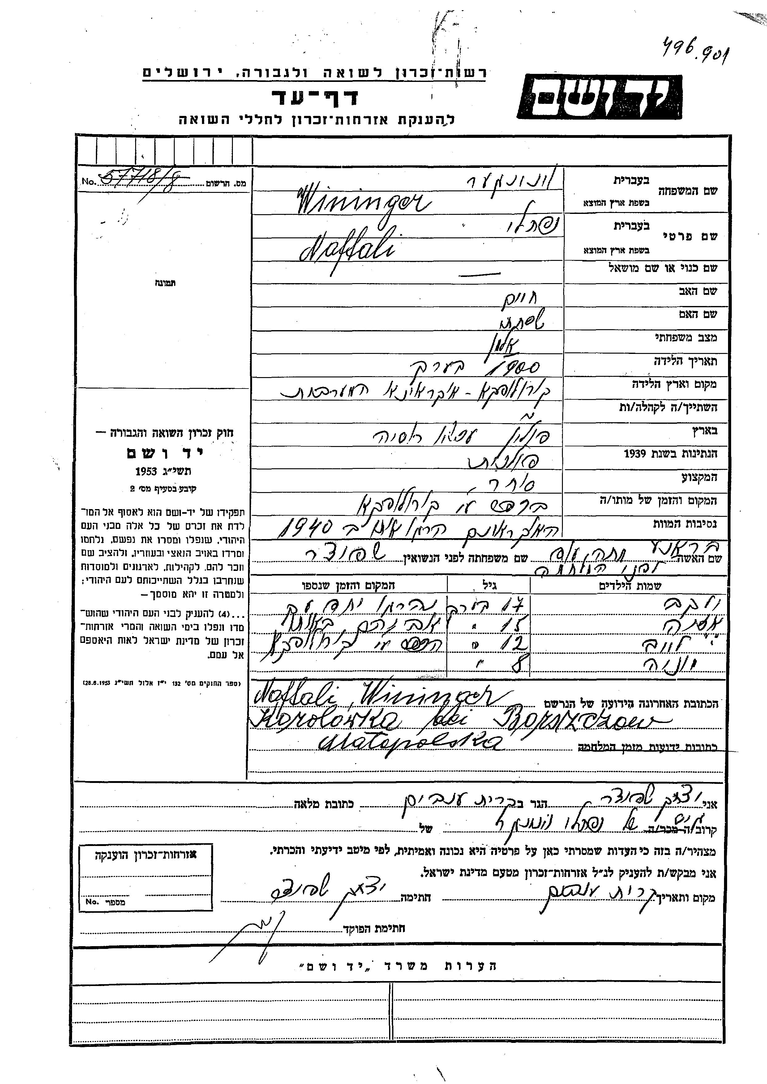 Wininger Ema Korolowka, Pologne Feuille de témoignage