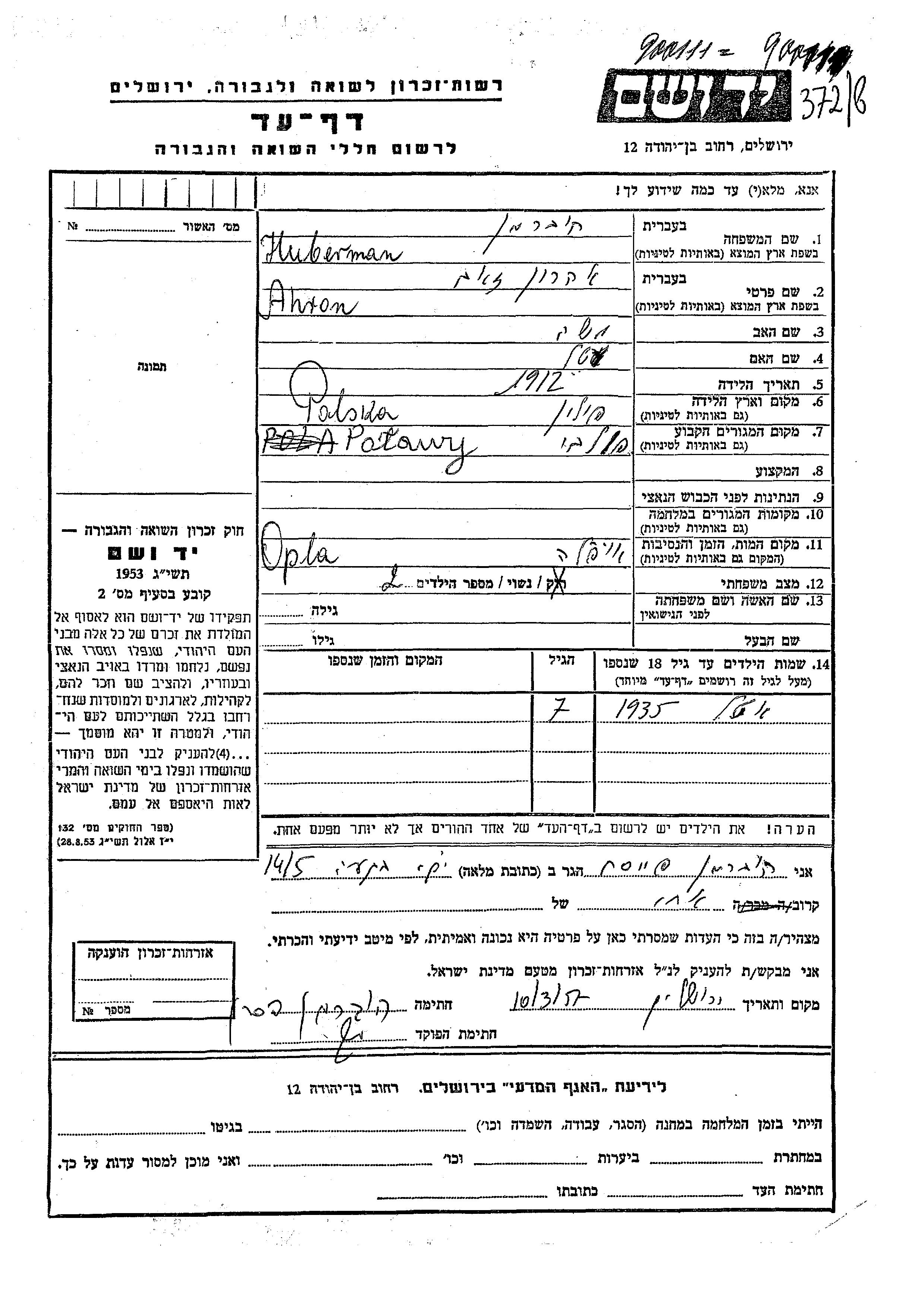 Huberman Etel Polawa, Pologne Feuille de témoignage