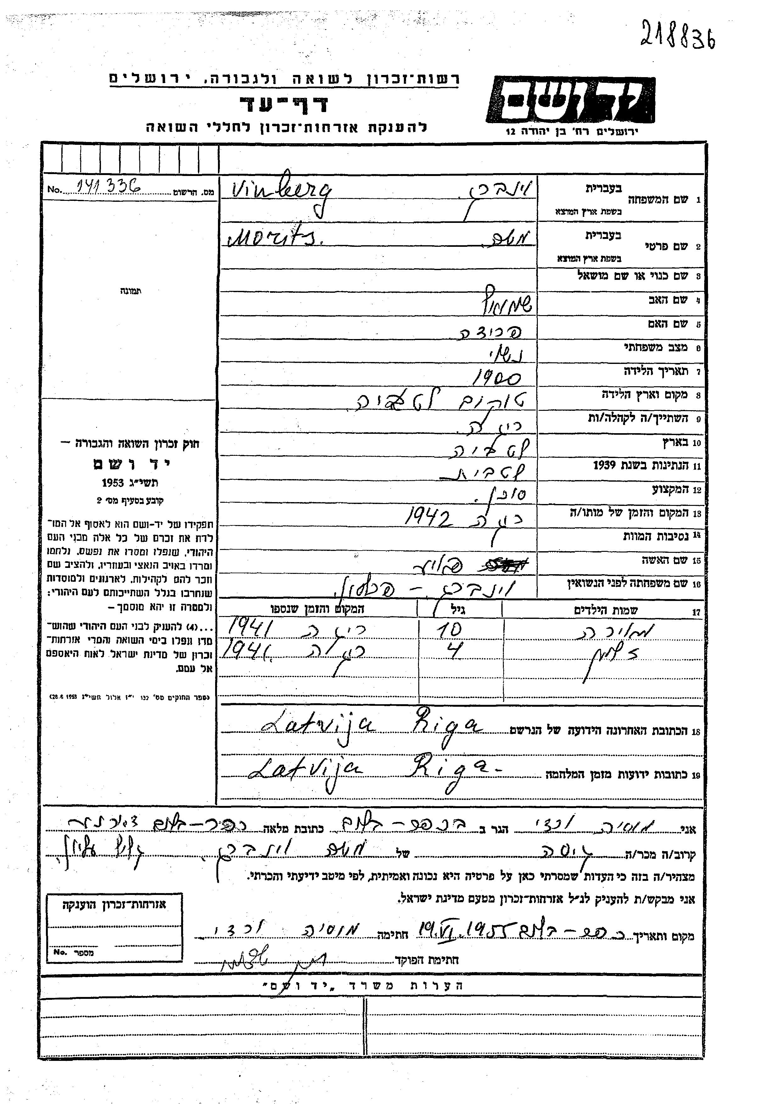 Vinberg Zalman Riga, Lettonie Feuille de témoignage