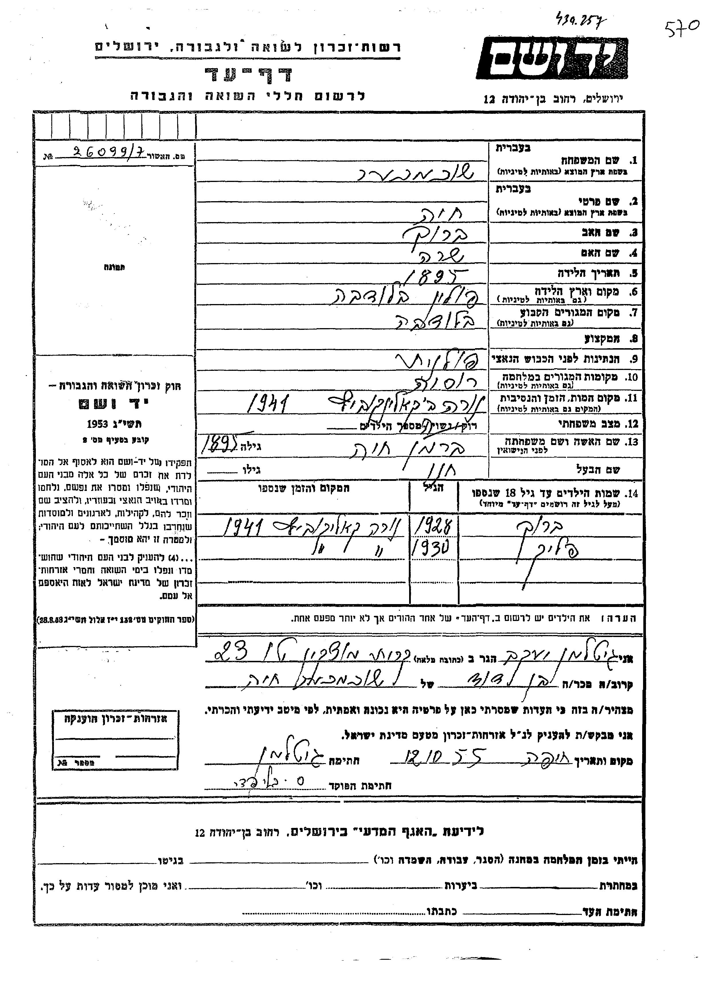Yad Vashem - Pages of Testimony Names Memorial Collection