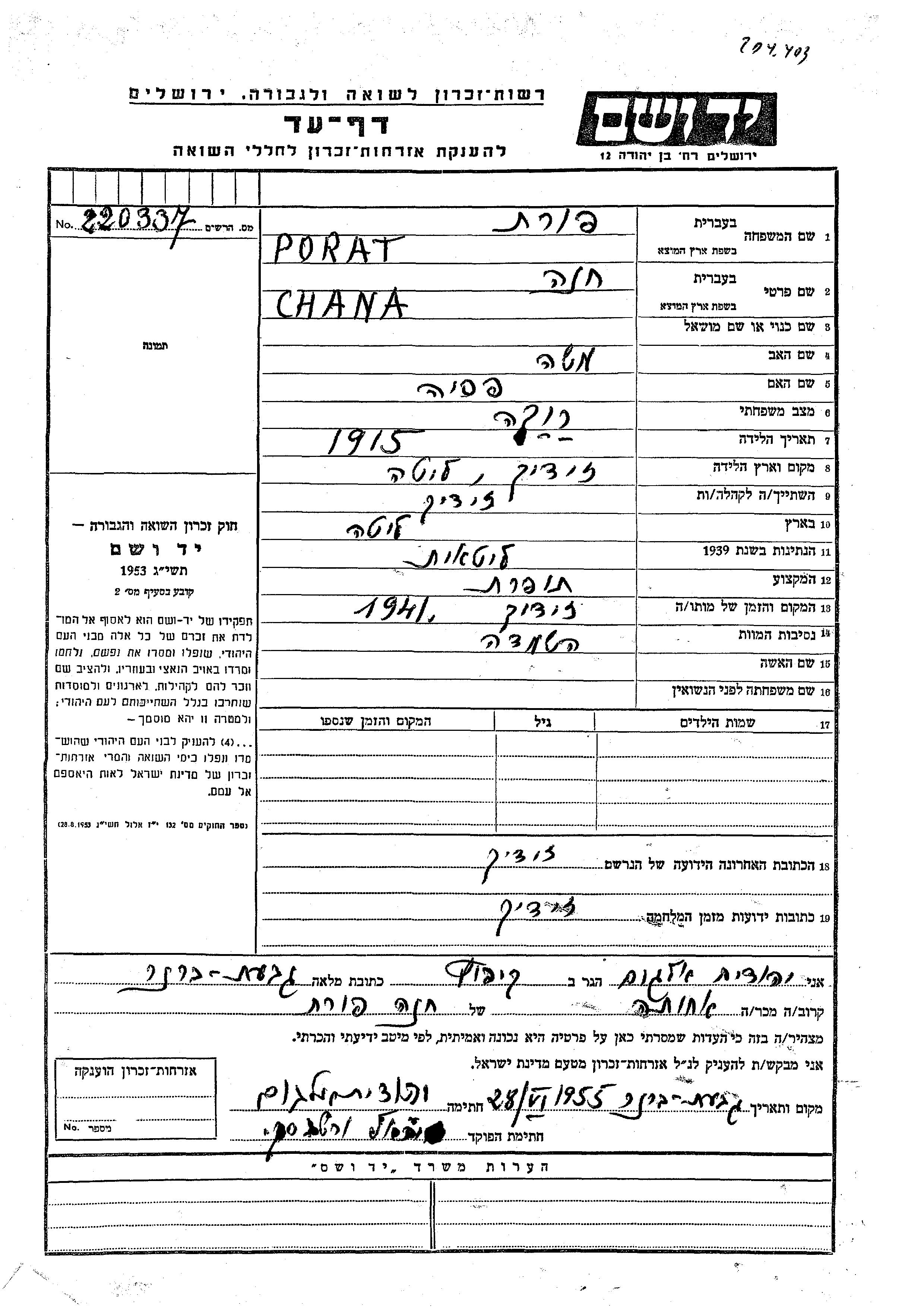 Chana Porat est née à Zidik, Lituanie en 1915, fille de Moshe et de Pesia. Elle était Couturière et Célibataire. Avant la seconde guerre mondiale elle vivait à Zidik, Lituanie. Pendant la guerre, elle était à Zidik, Lituanie.