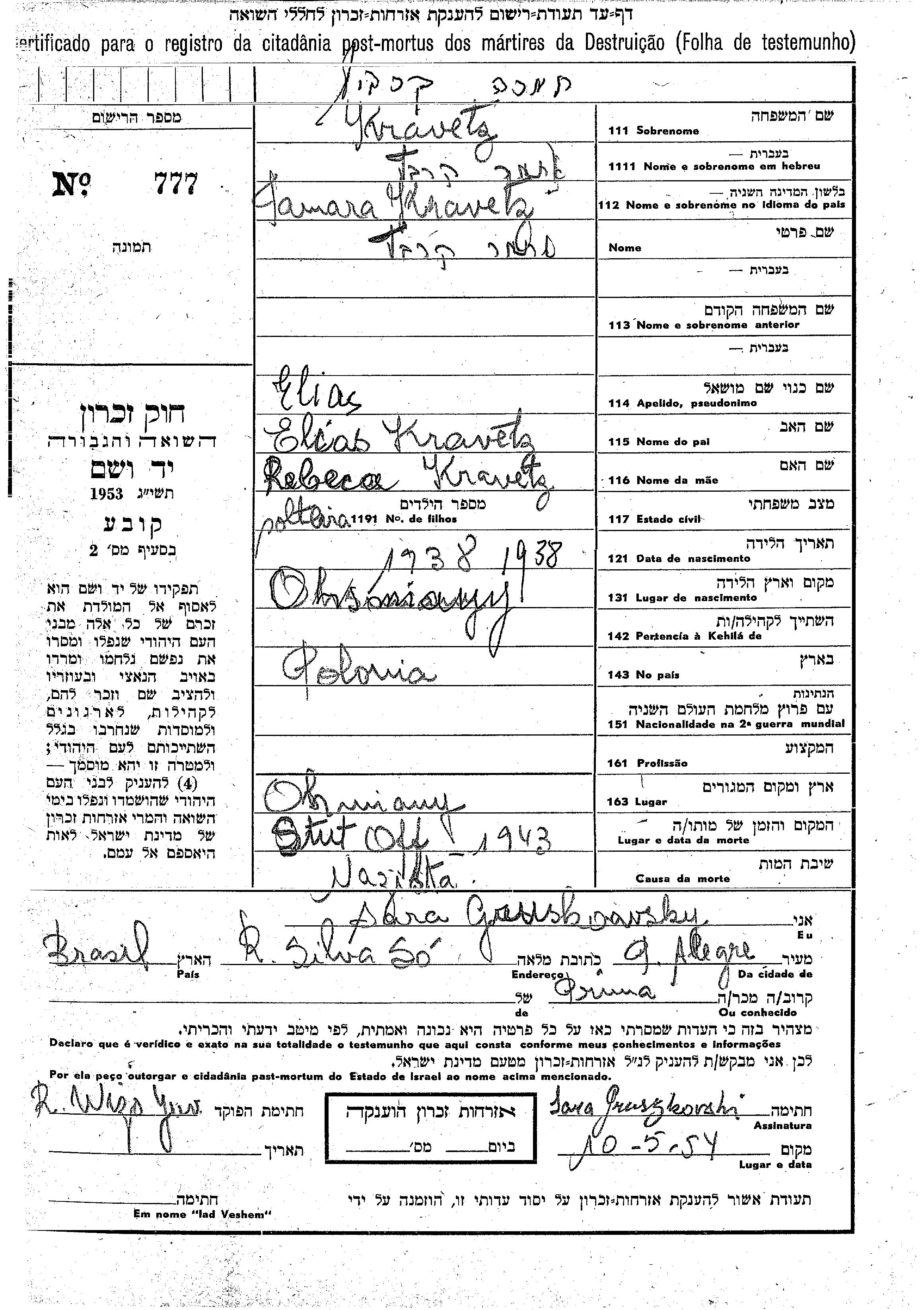 Kravitz Tamara 1938 Oszmiana, Pologne Feuille de témoignage