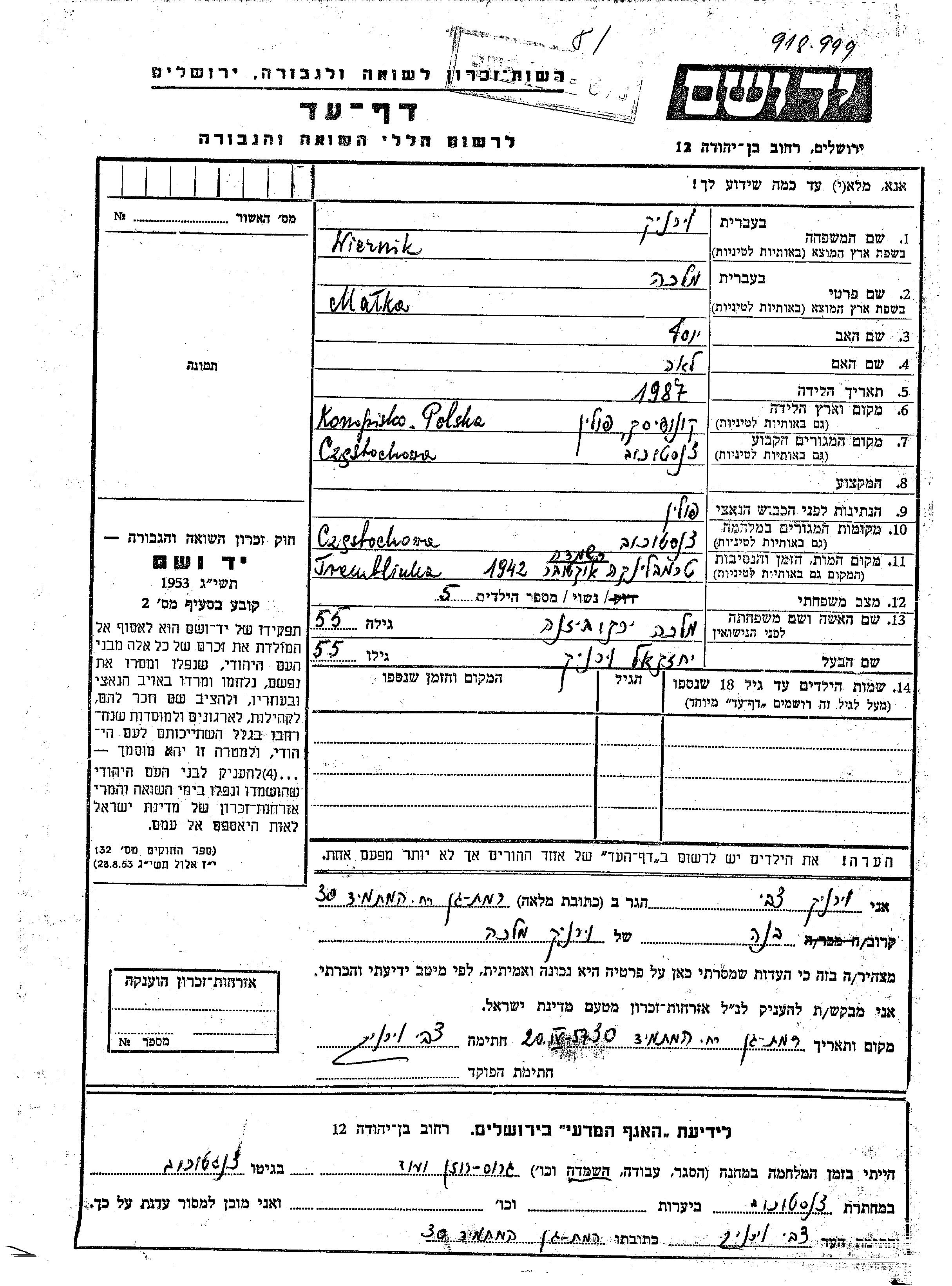 Wiernik Virnyk Malka 1887 Czestochowa, Pologne Feuille de témoignage