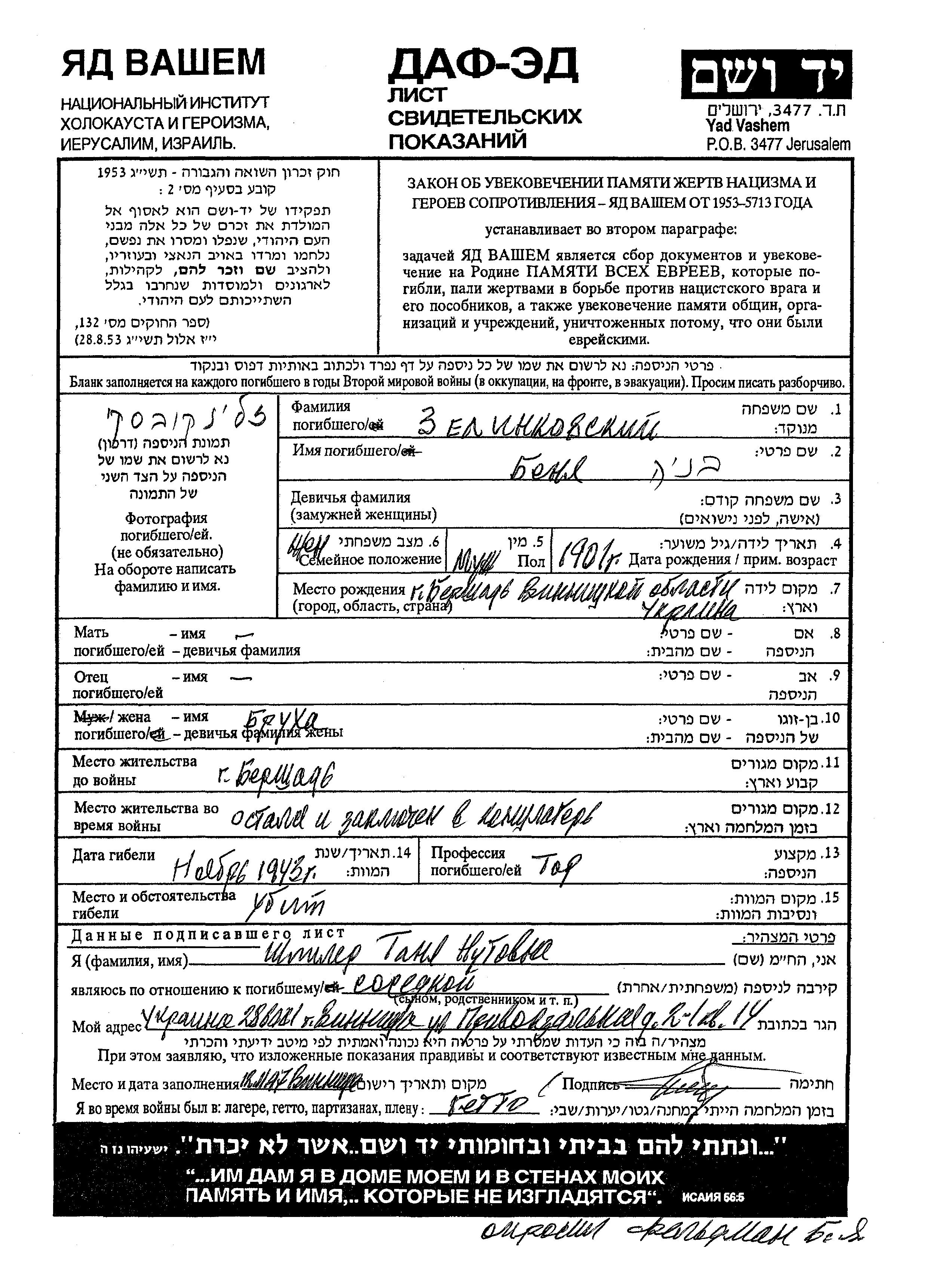 Zelinkovski Benya 1901 Bershad, Ukraine (URSS) Feuille de témoignage