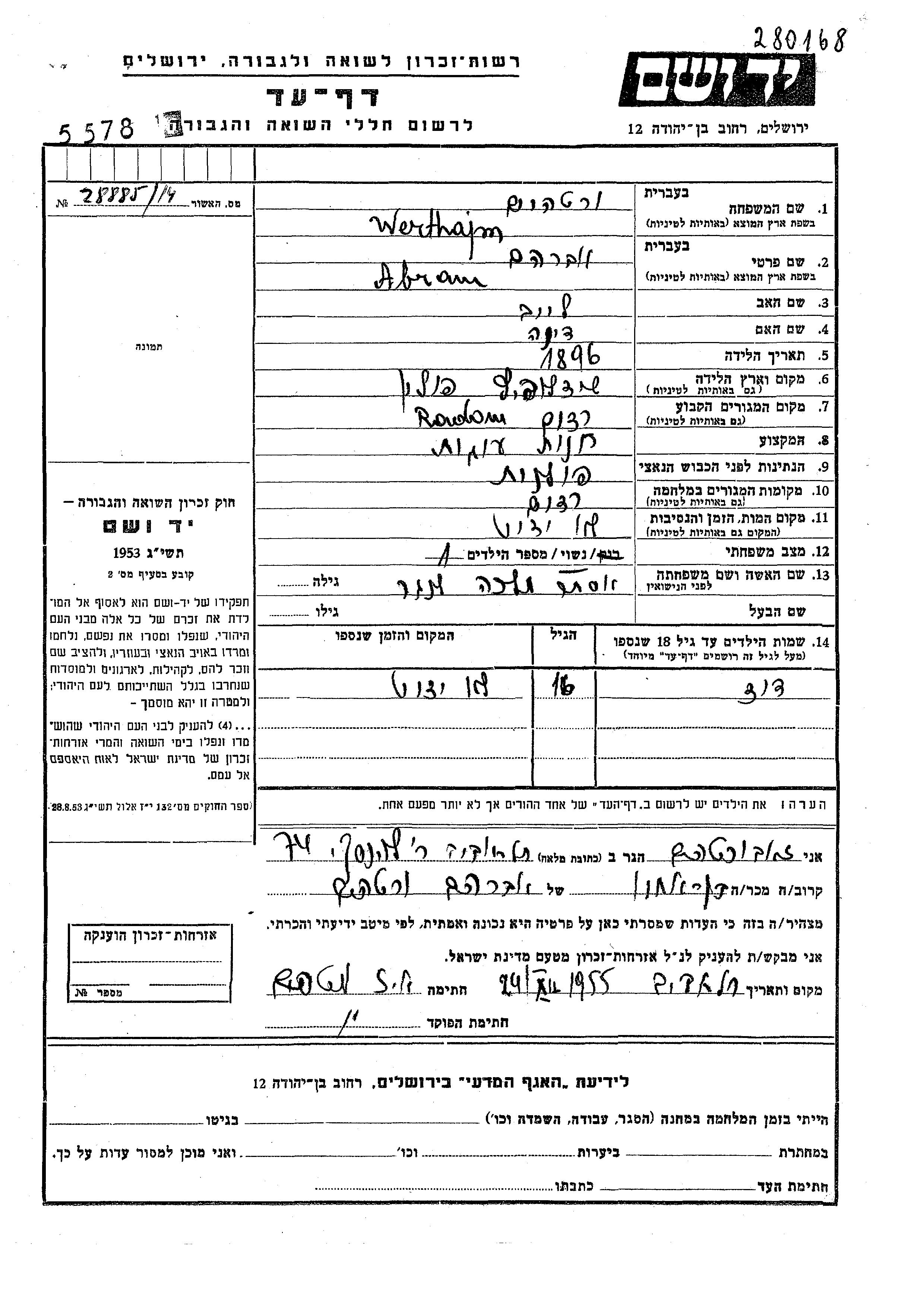 Werthajm Abram 1896 Radom, Pologne Feuille de témoignage