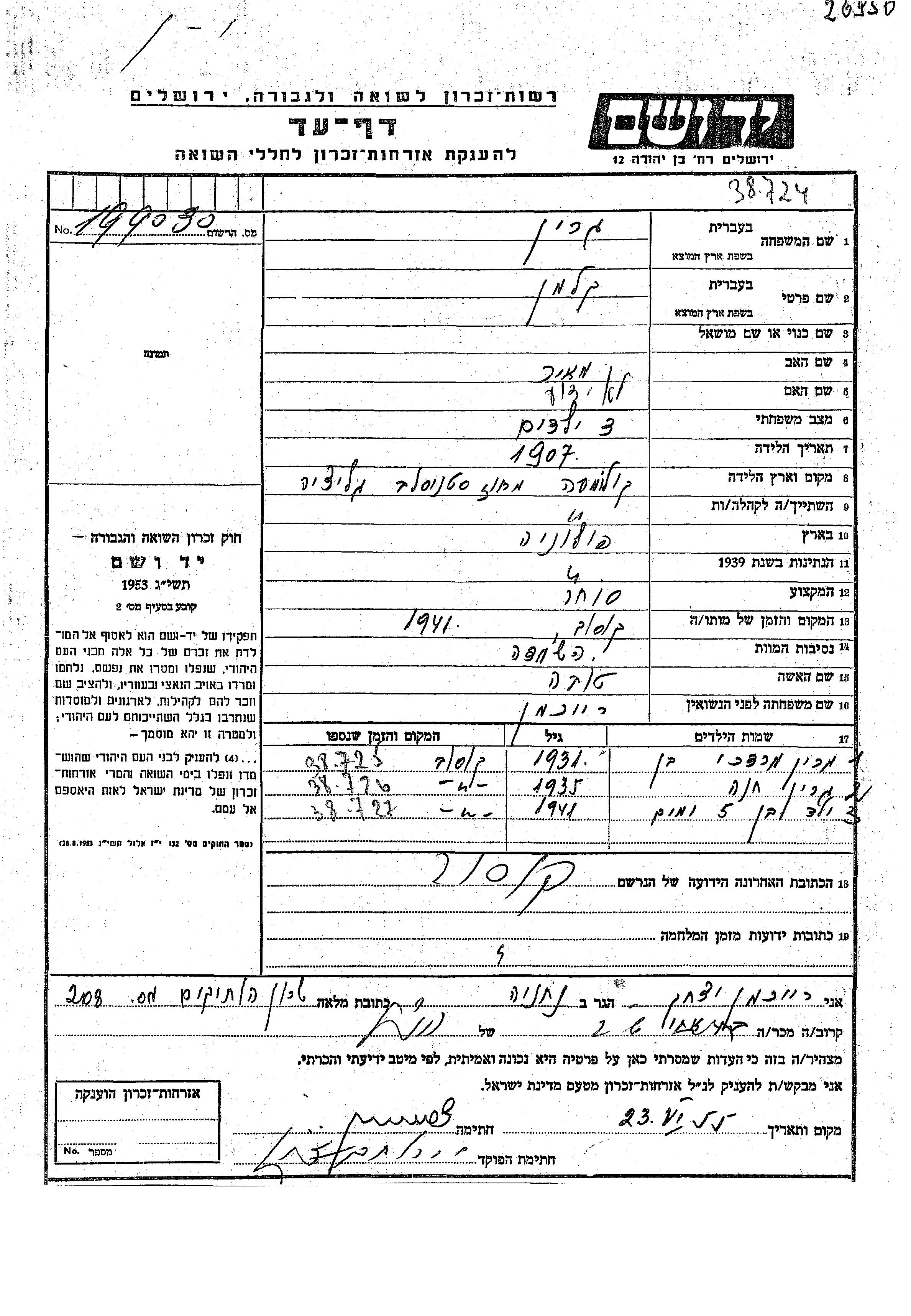 Kalman a été assassiné pendant la Shoah. Lieu de la mort: Kosow, Pologne en 1941.