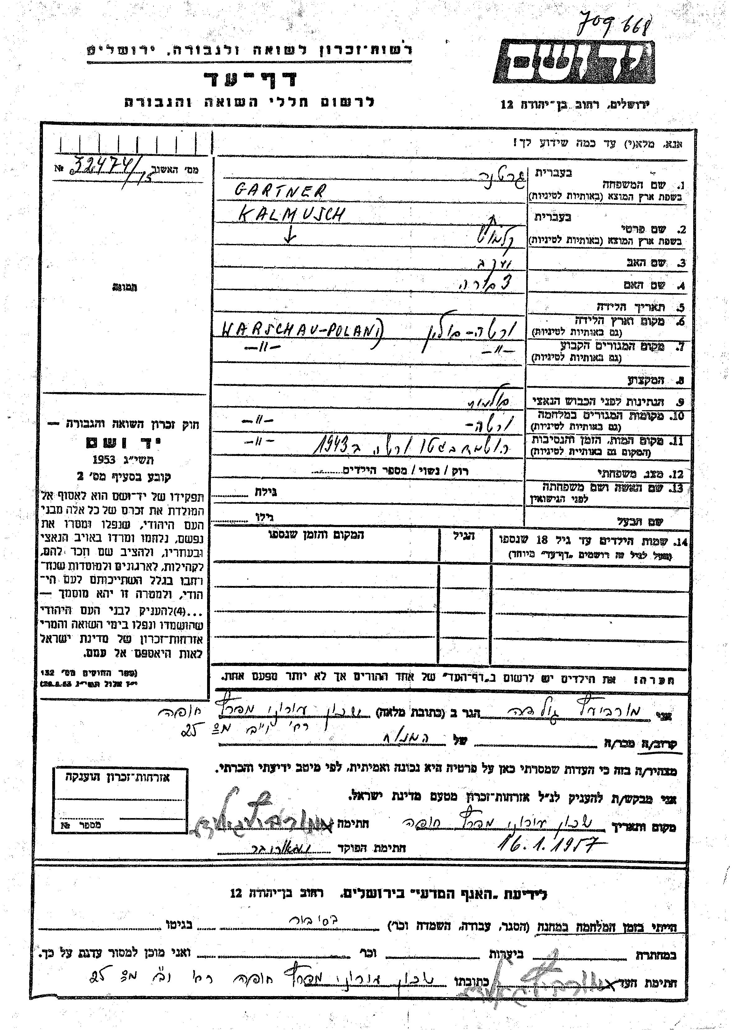 Kalmusch Gartner est né à Warsaw, Pologne, fils de Yaakov et de Dvora. Avant la seconde guerre mondiale il vivait à Warsaw, Pologne. Au cours de la guerre, il était à Warsaw, Pologne.