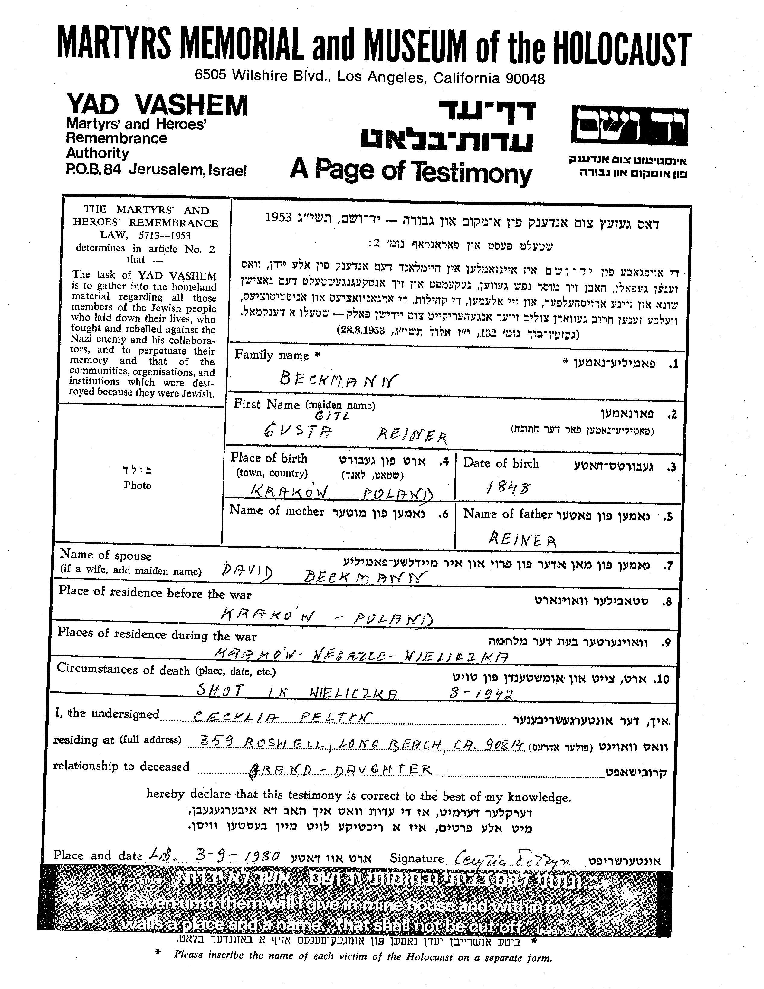 Gusta Gitl Beckman née Reiner est née à Krakow, Pologne en 1848. Elle était Mariée à David. Avant la seconde guerre mondiale elle vivait à Krakow, Pologne. Pendant la guerre, elle était à Krakow, Pologne.