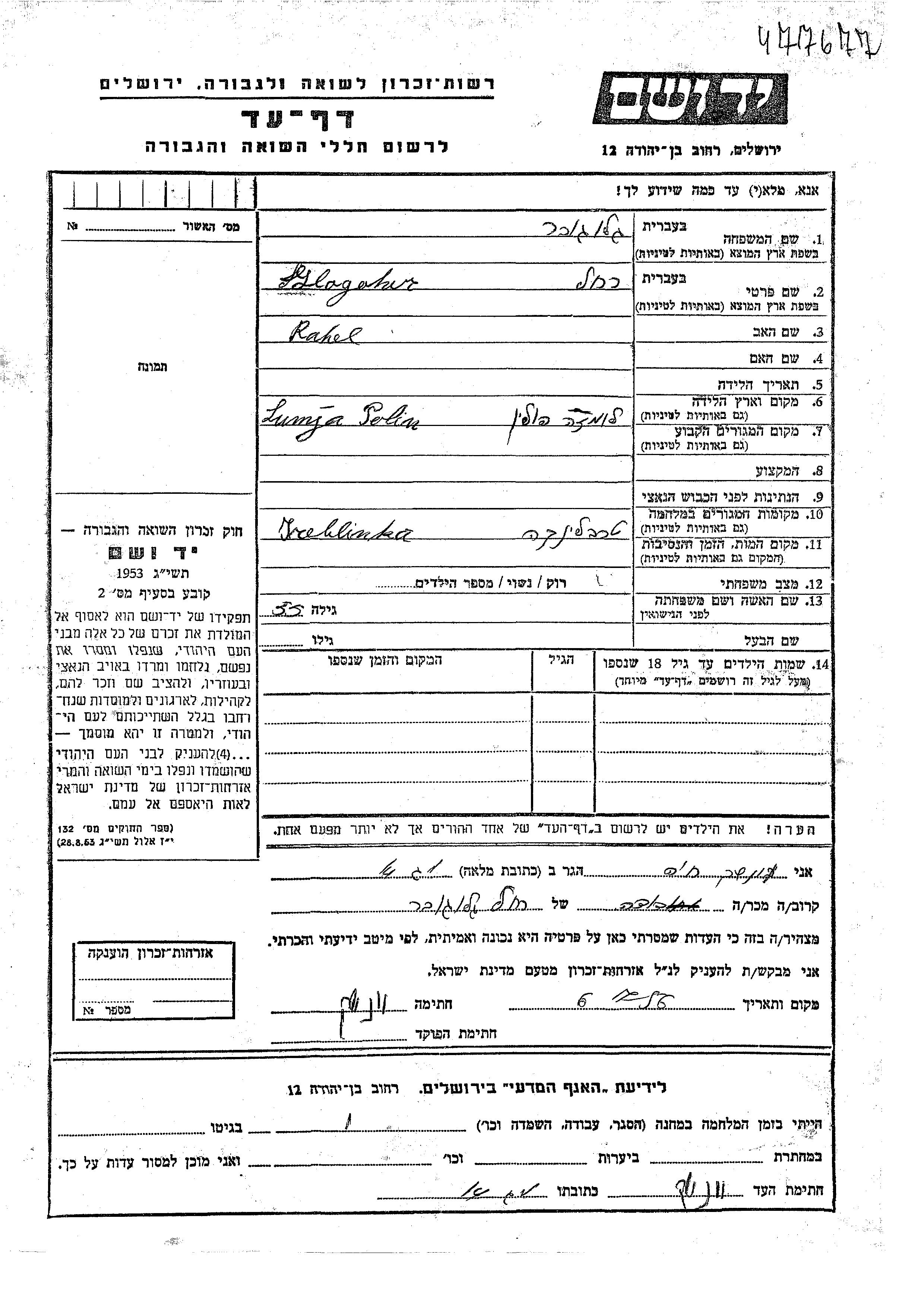 Glogover Rahel endroit inconnu, Feuille de témoignage