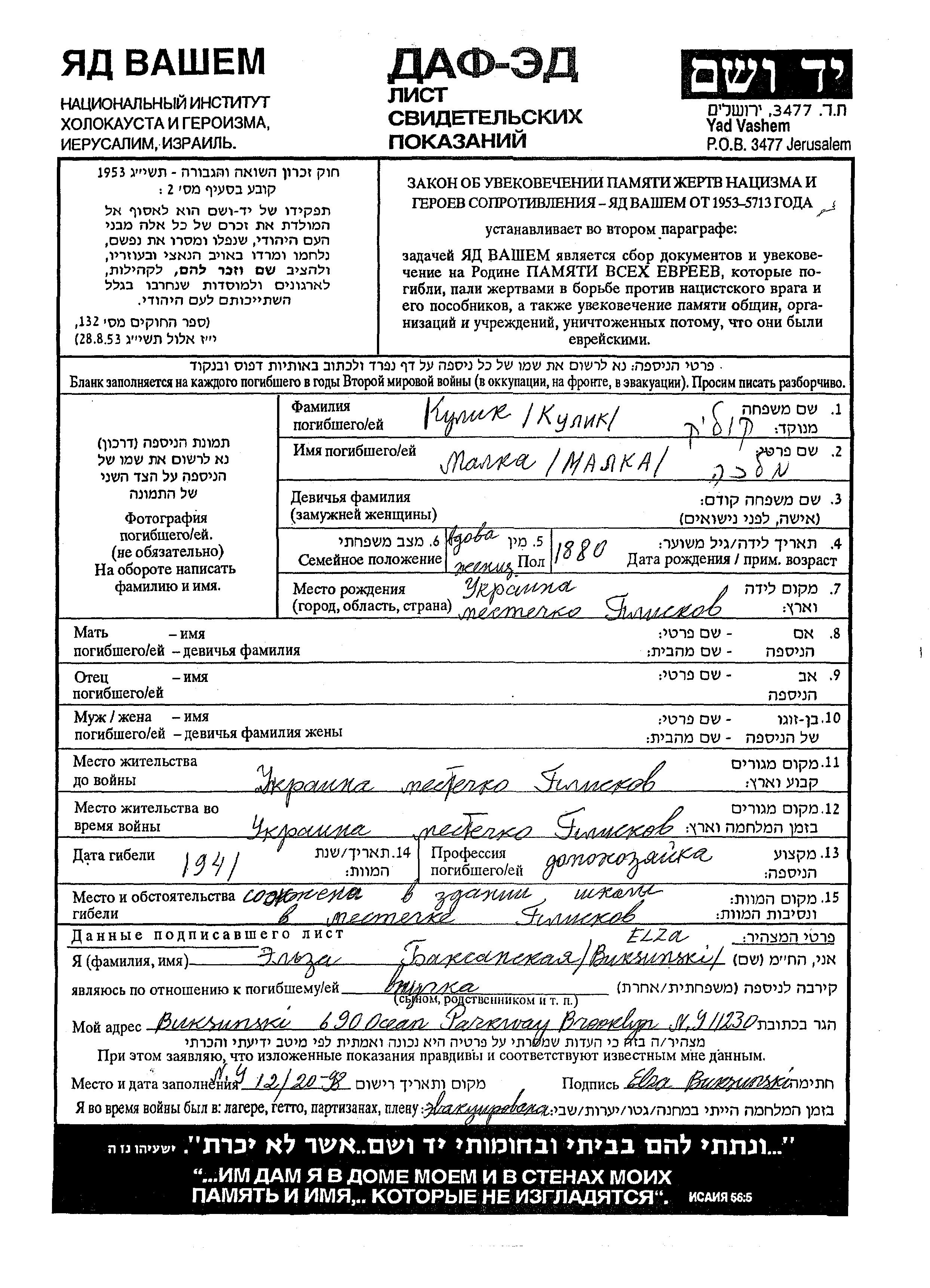 Kulik Malka 1880 Pliskov, Ukraine (URSS) Feuille de témoignage