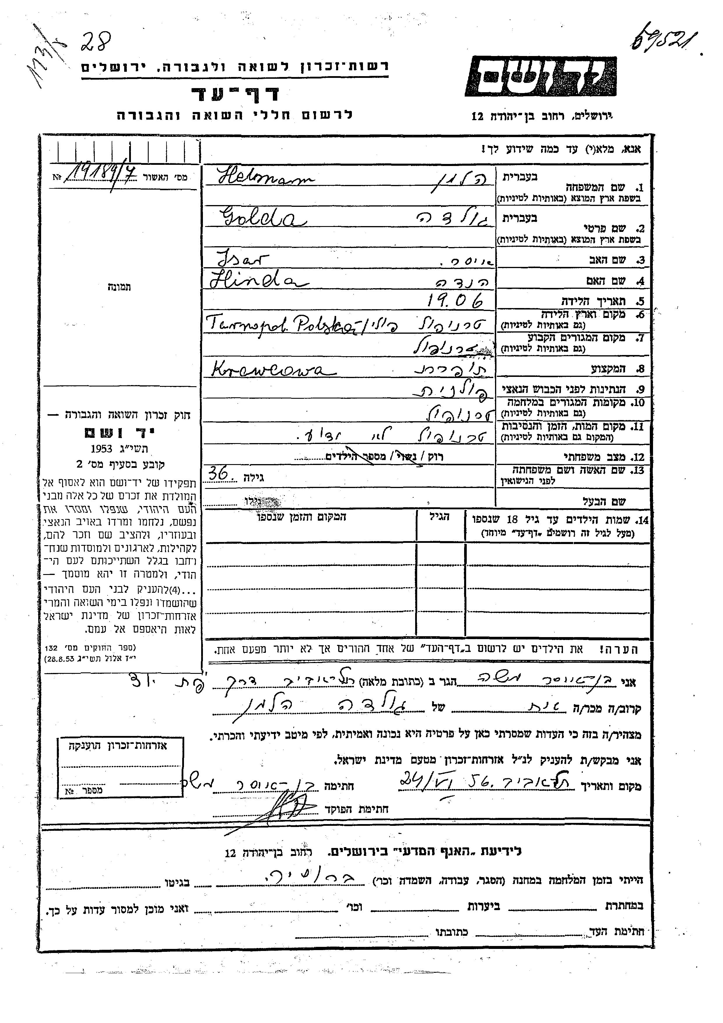 Helman Golda 1906 Tarnopol, Pologne Feuille de témoignage