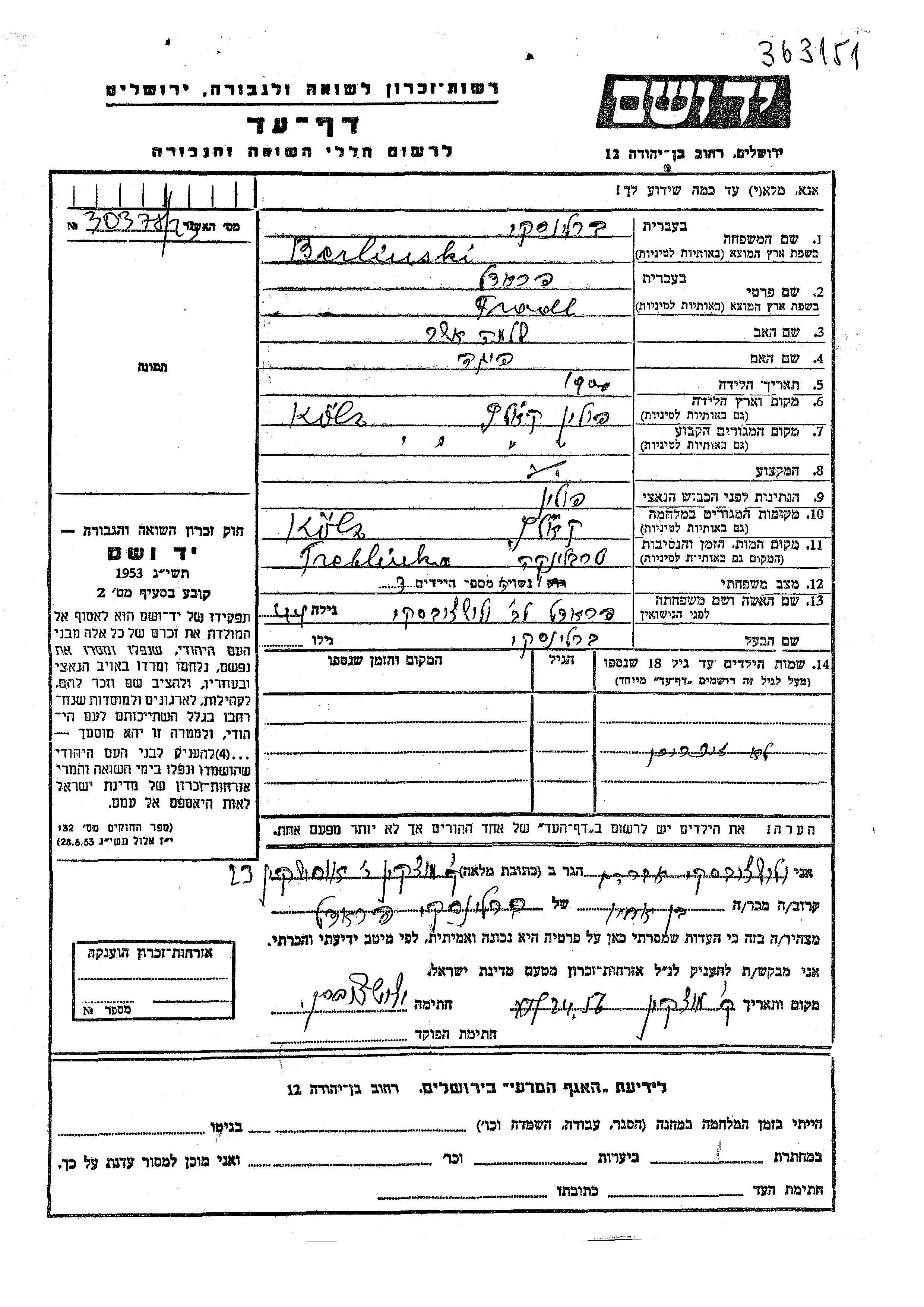 Berlinski Fradl Fradel 1900 Kielce, Pologne Feuille de témoignage