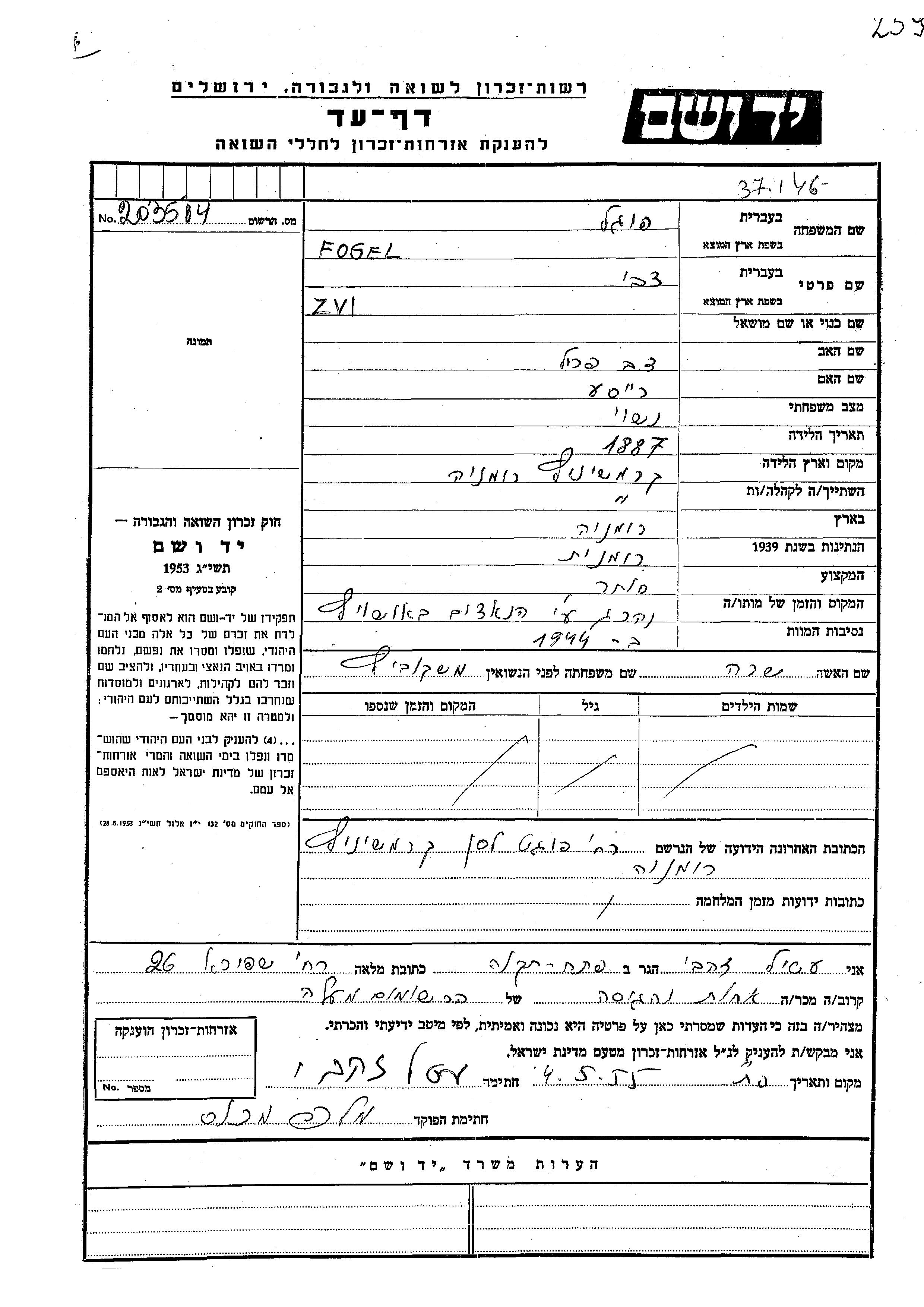 Zvi Fogel est né à Cormenis, Roumanie en 1887, fils de Dov Peril et de Reise Peril. Il était Commerçant/e. Avant la seconde guerre mondiale il vivait à Cormenis, Roumanie. Au cours de la guerre, il était à Cormenis, Roumanie.