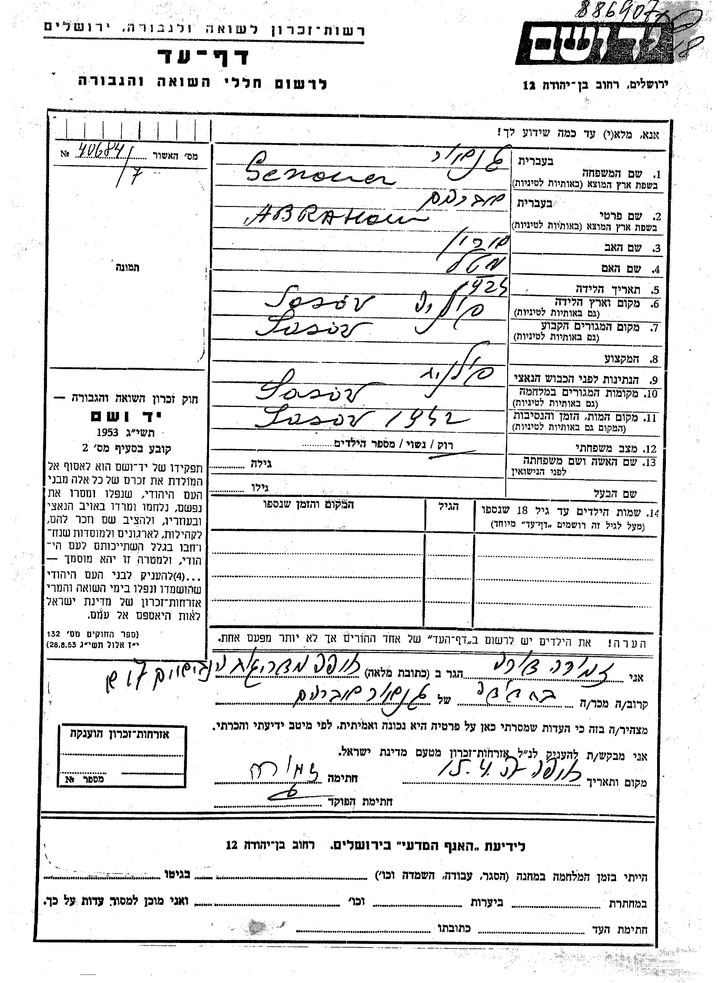 Genauer Genover Abraham 1923 Sasow, Pologne Feuille de témoignage