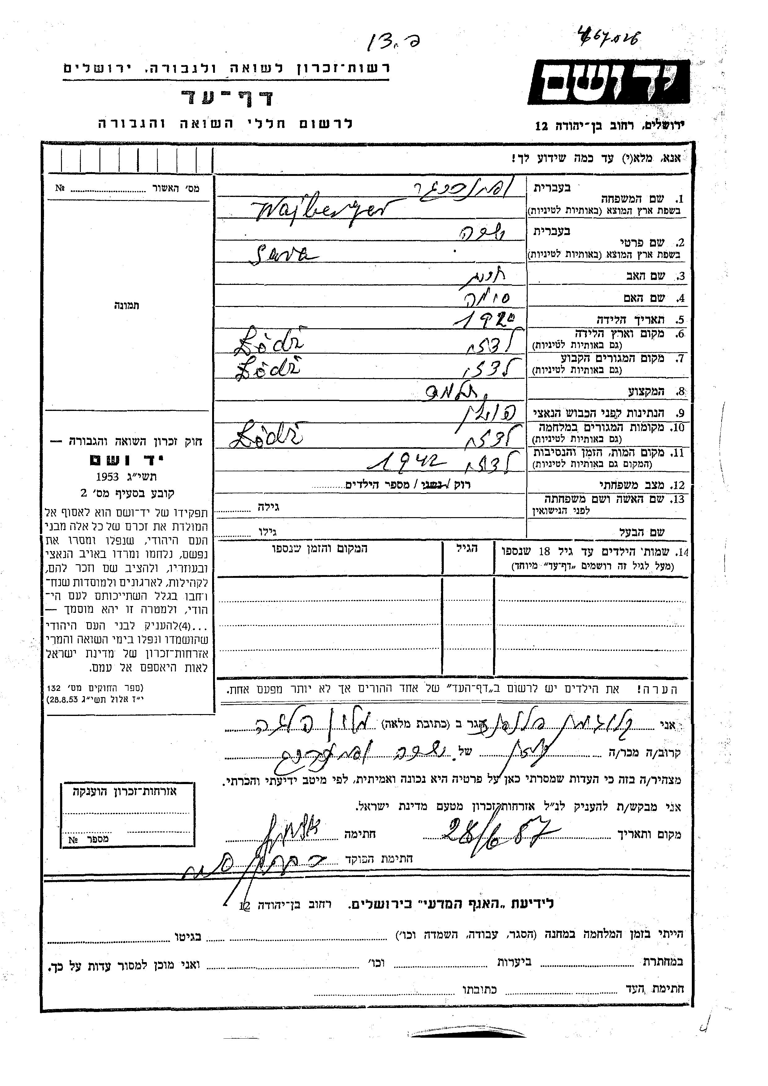 Wajberger Sara 1920 Lodz, Pologne Feuille de témoignage