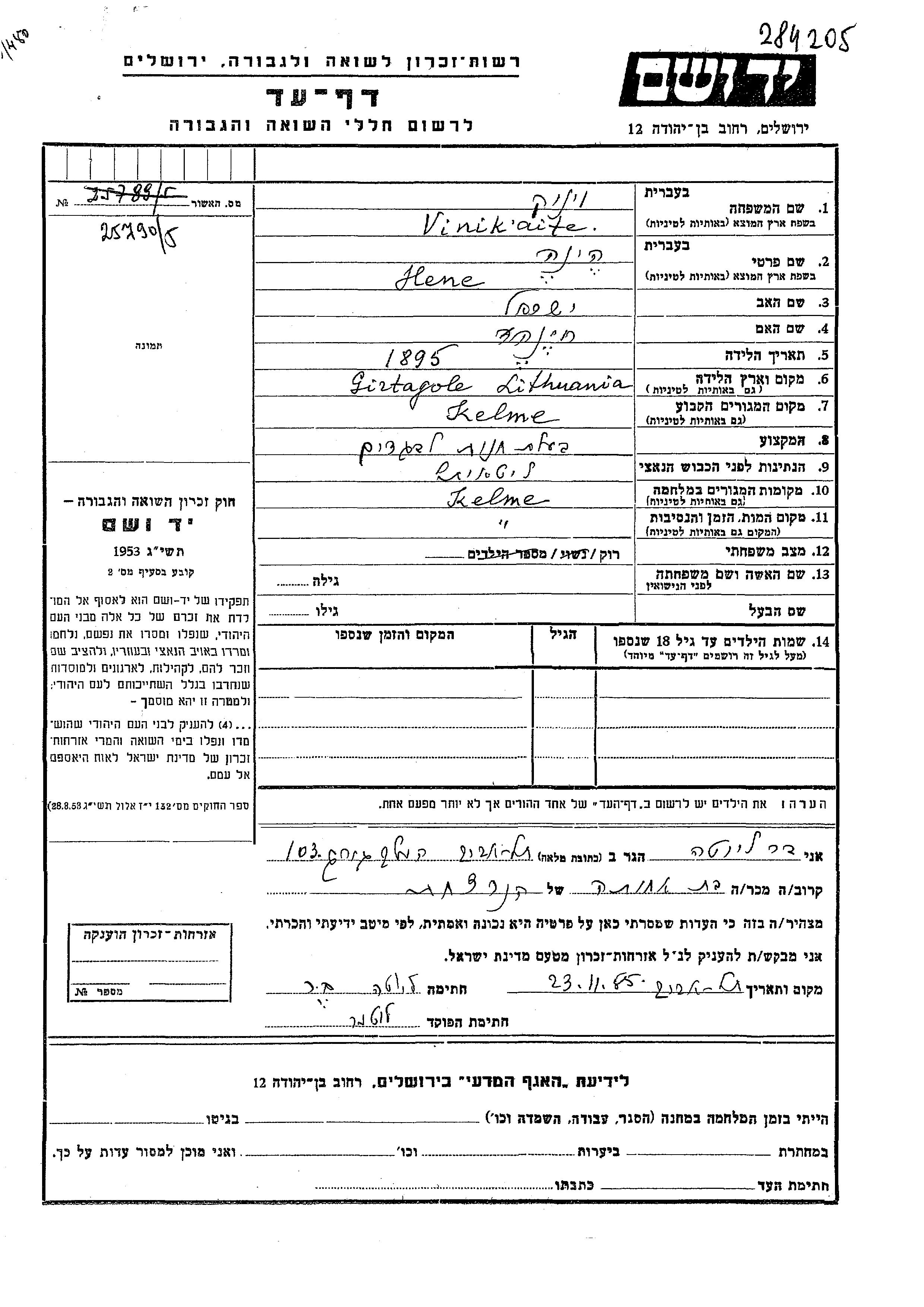 Hene Vinikaite est née à Girtagola, Lituanie en 1895, fille de Yisrael et de Khina. Elle était Propriétaire d'un magasin de vêtements et Célibataire. Avant la seconde guerre mondiale elle vivait à Kelmė, Lituanie. Pendant la guerre, elle était à Kelmė, Lituanie.