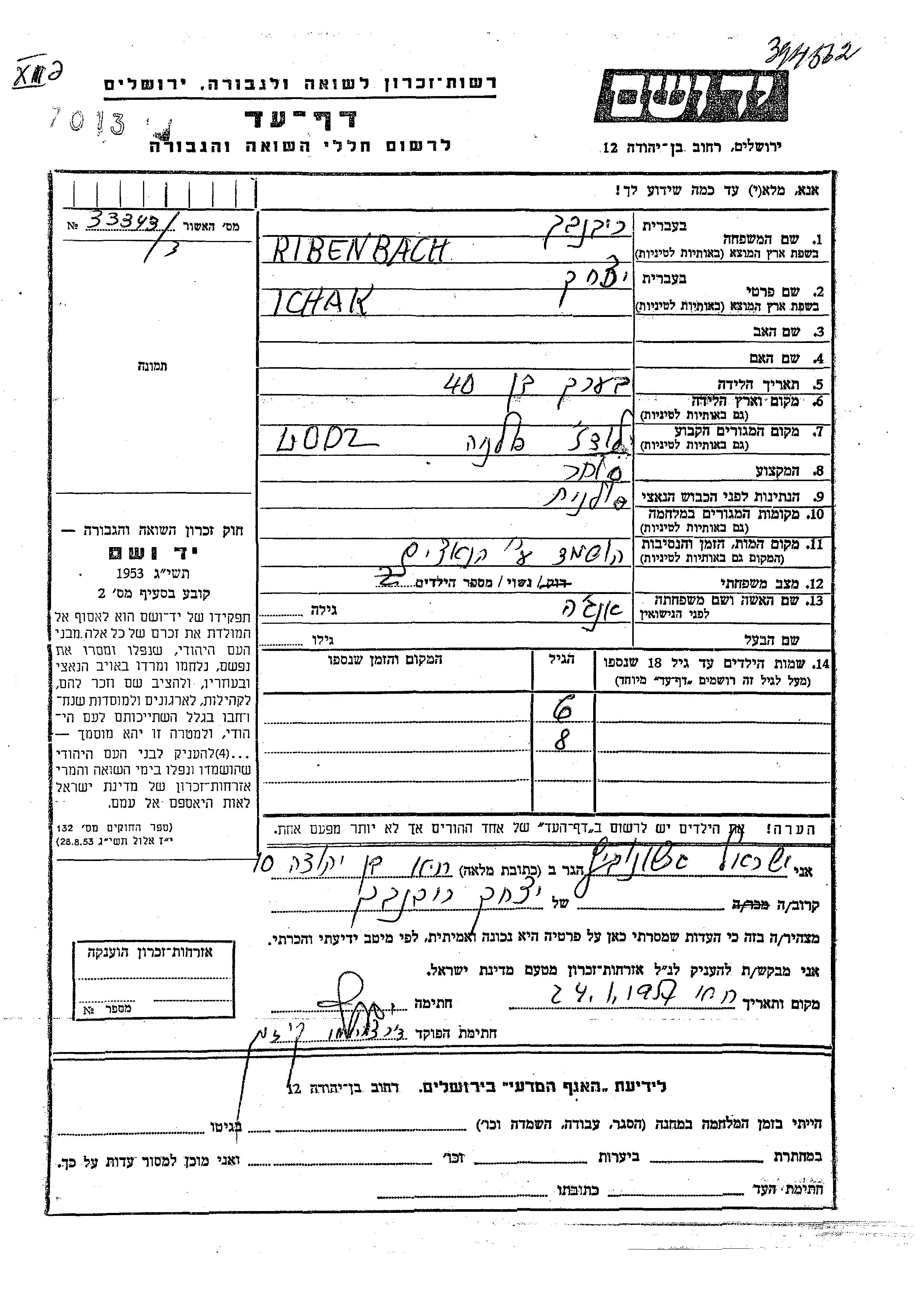 Ribenbach prénom inconnu Lodz, Pologne Feuille de témoignage