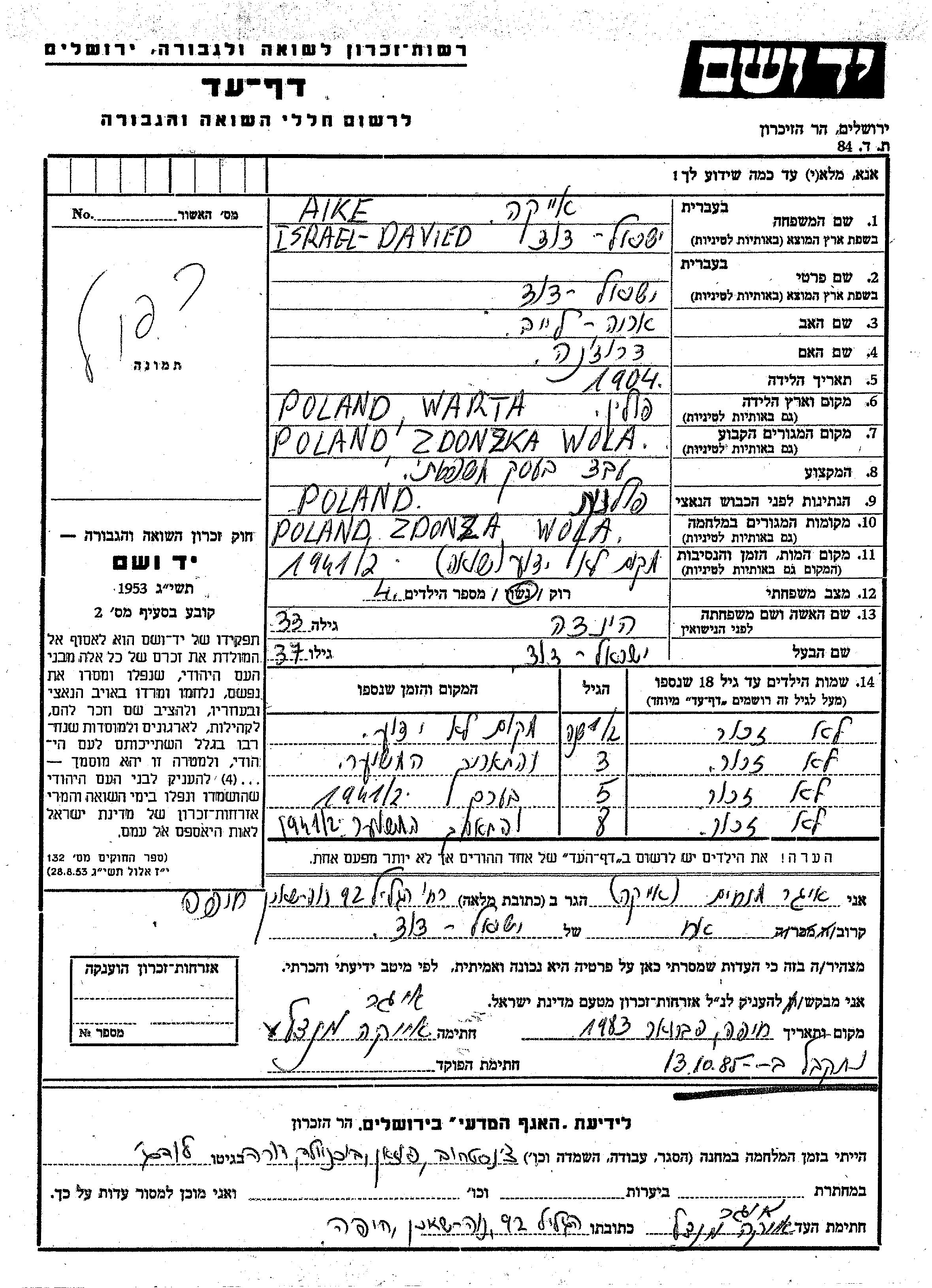 Aike prénom inconnu Zdunska Wola, Pologne Feuille de témoignage