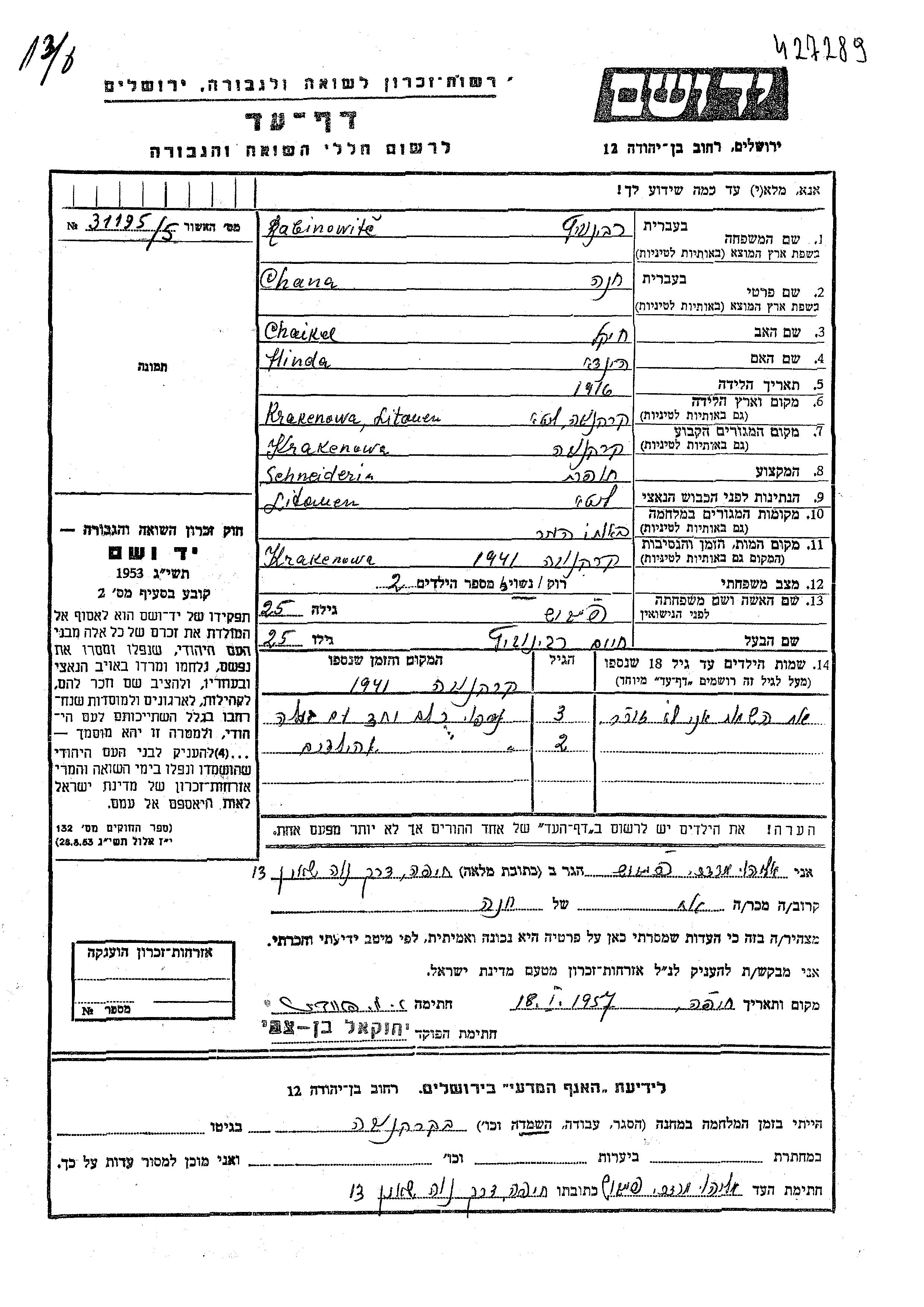 Rabinowitc prénom inconnu Krakenovo, Lituanie Feuille de témoignage