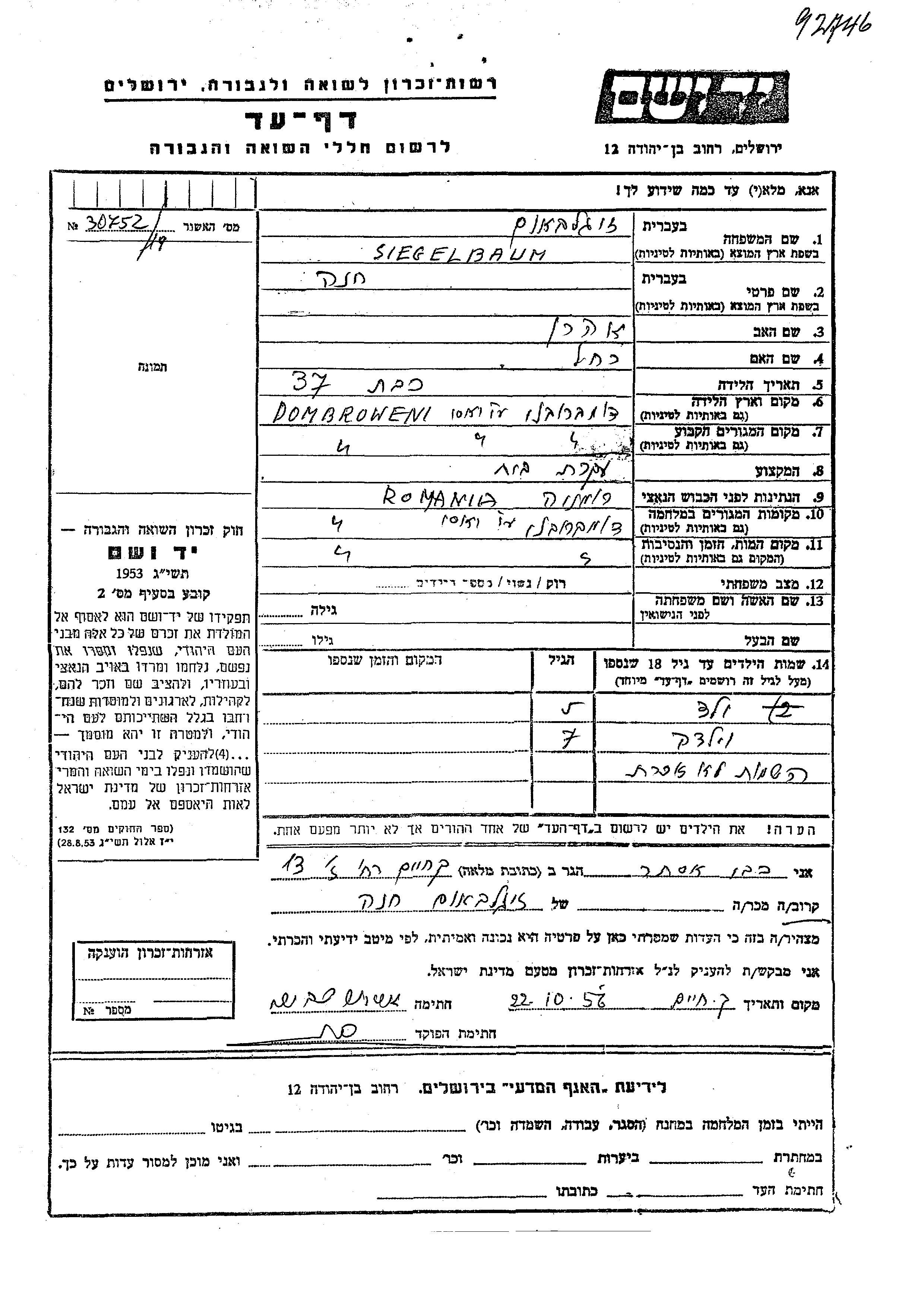Siegelbaum prénom inconnu Dombroven, Roumanie Feuille de témoignage