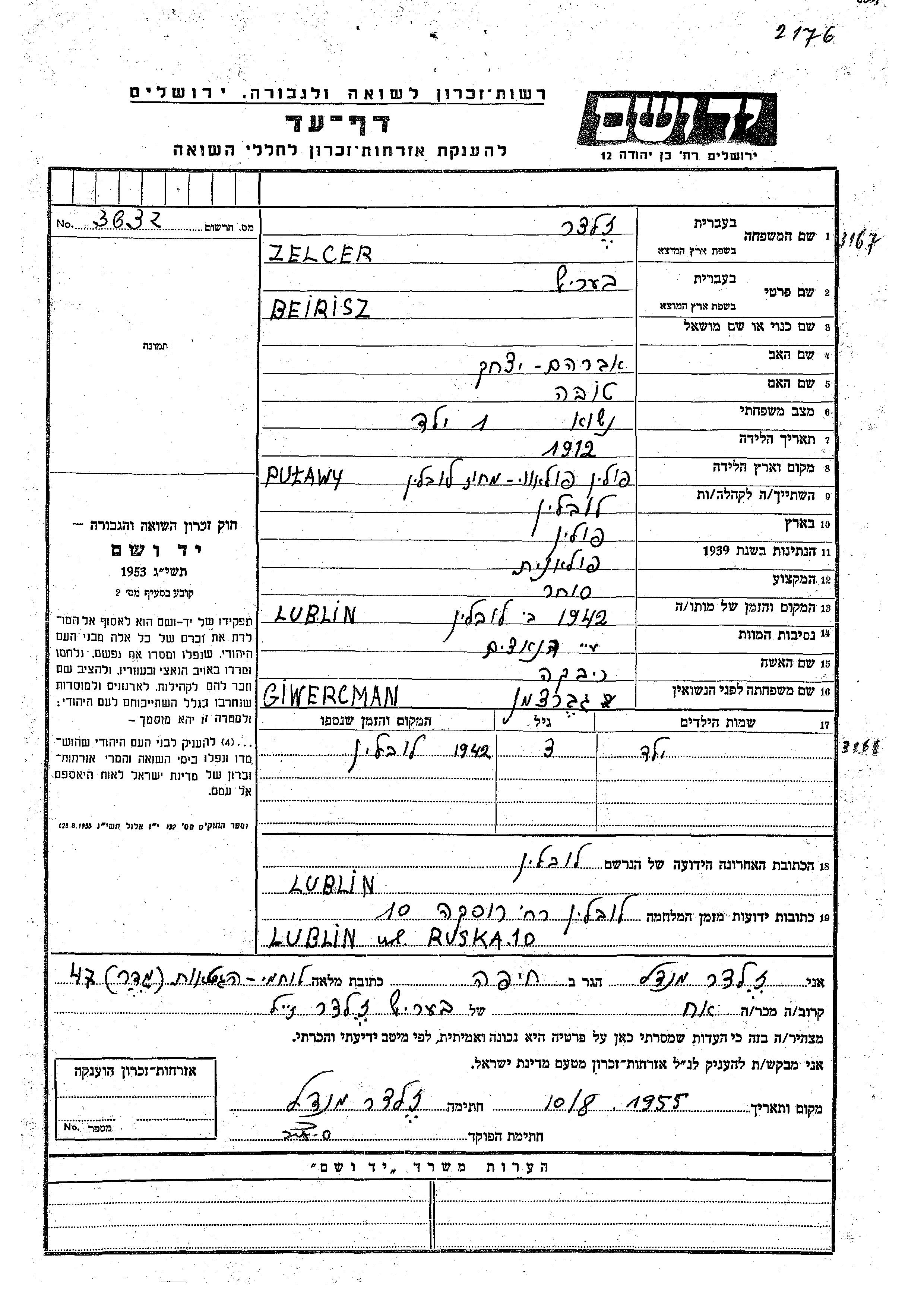 Zelcer prénom inconnu Pulawy, Pologne Feuille de témoignage