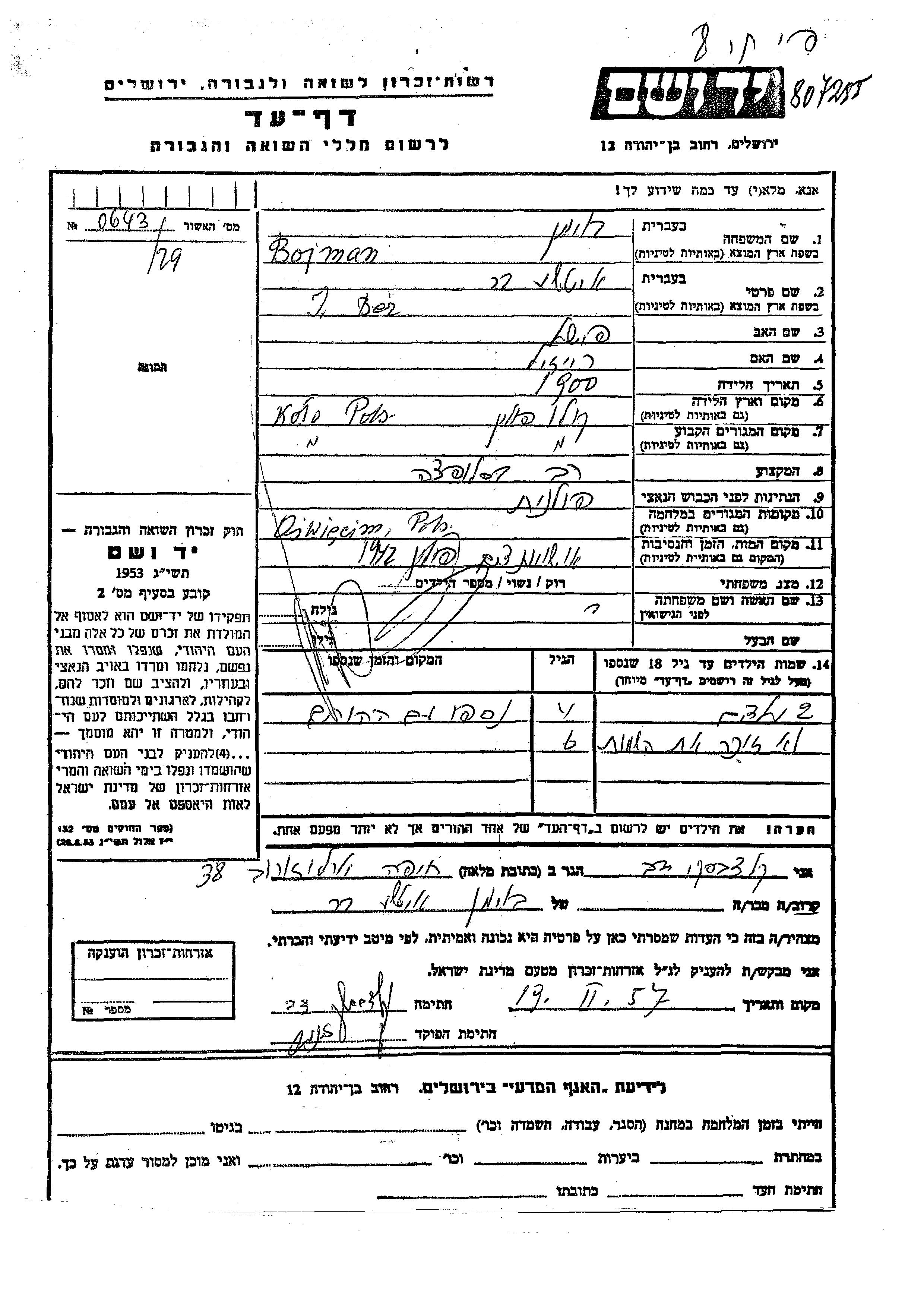Boiman prénom inconnu Kolo, Pologne Feuille de témoignage