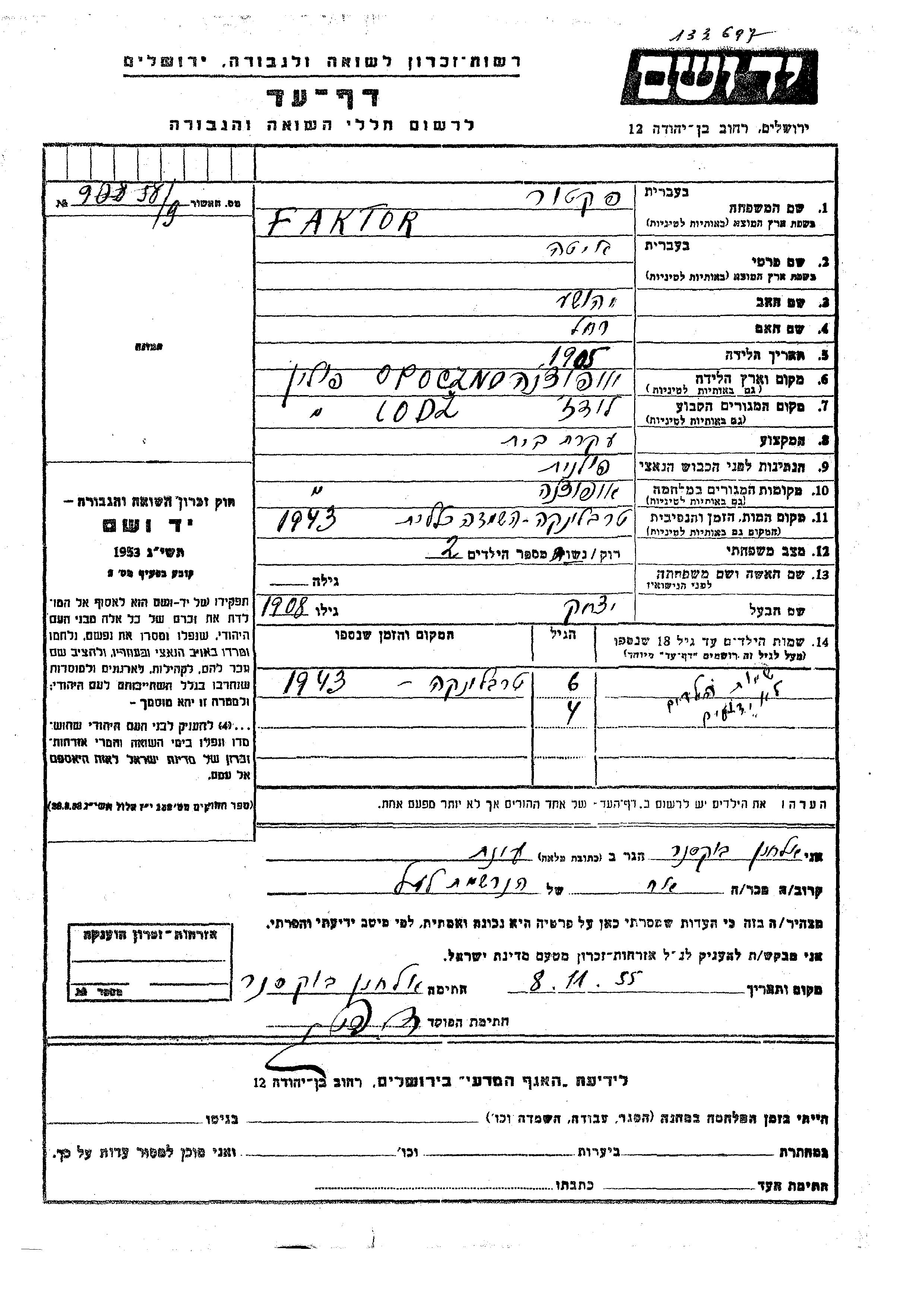 prénom inconnu Faktor est né/e fils/fille de Yitzkhak et de Ita. Il/elle était Enfant. Avant la seconde guerre mondiale vivait à Lodz, Pologne. Au cours de la guerre elle était à Opoczno, Pologne.