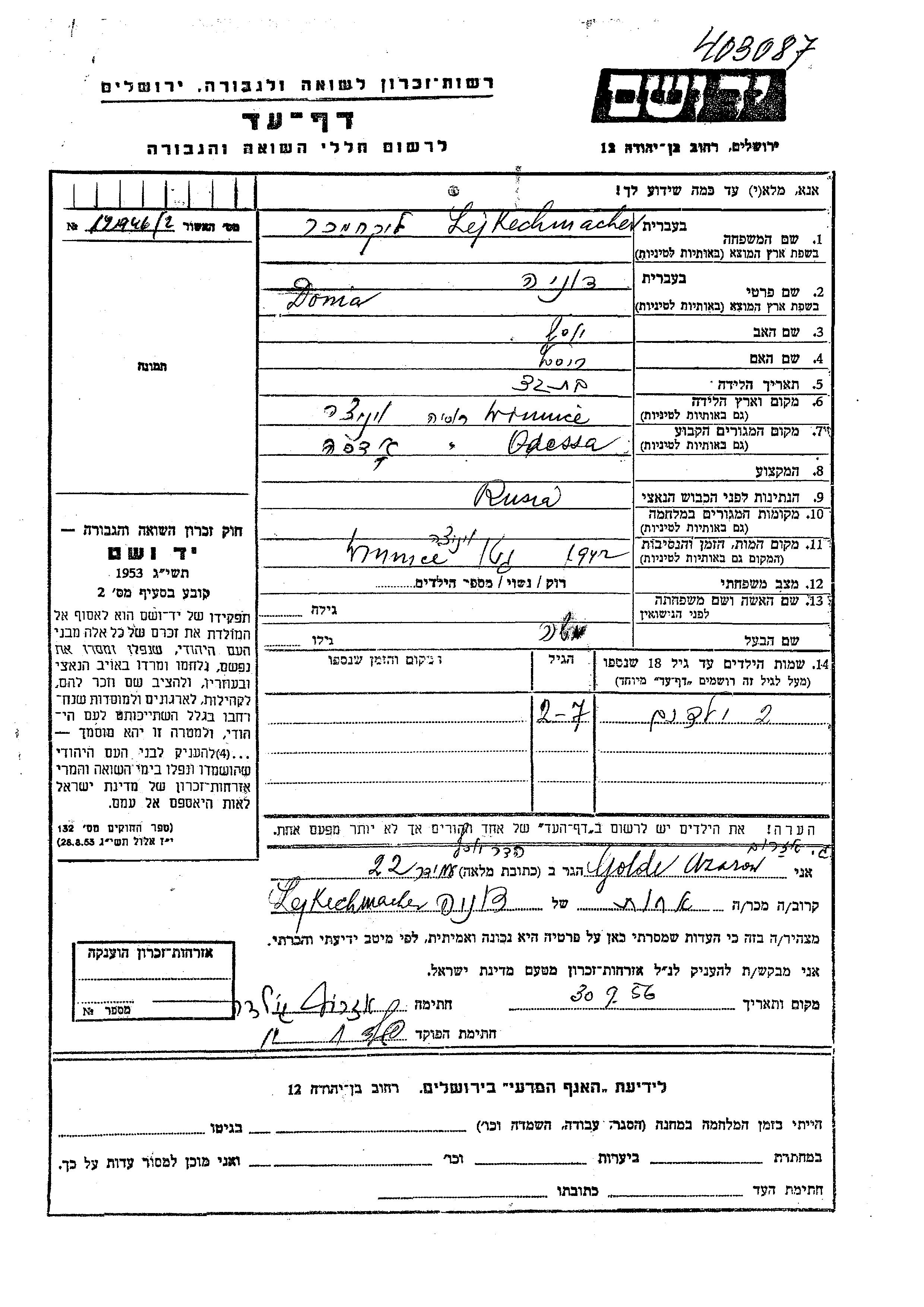 Lejkechmacher prénom inconnu Odessa, Ukraine (URSS) Feuille de témoignage