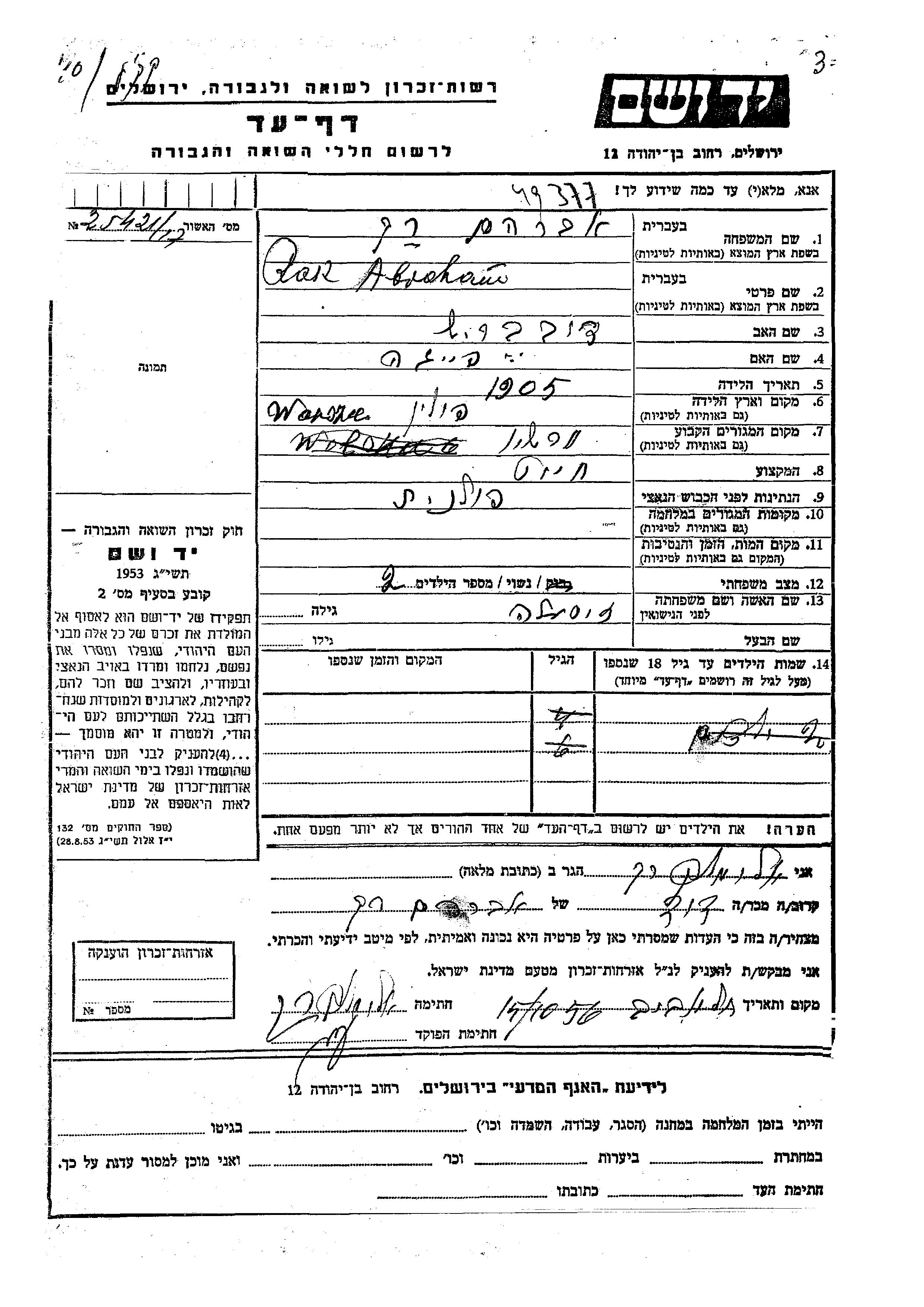 Rak prénom inconnu Warszawa, Pologne Feuille de témoignage