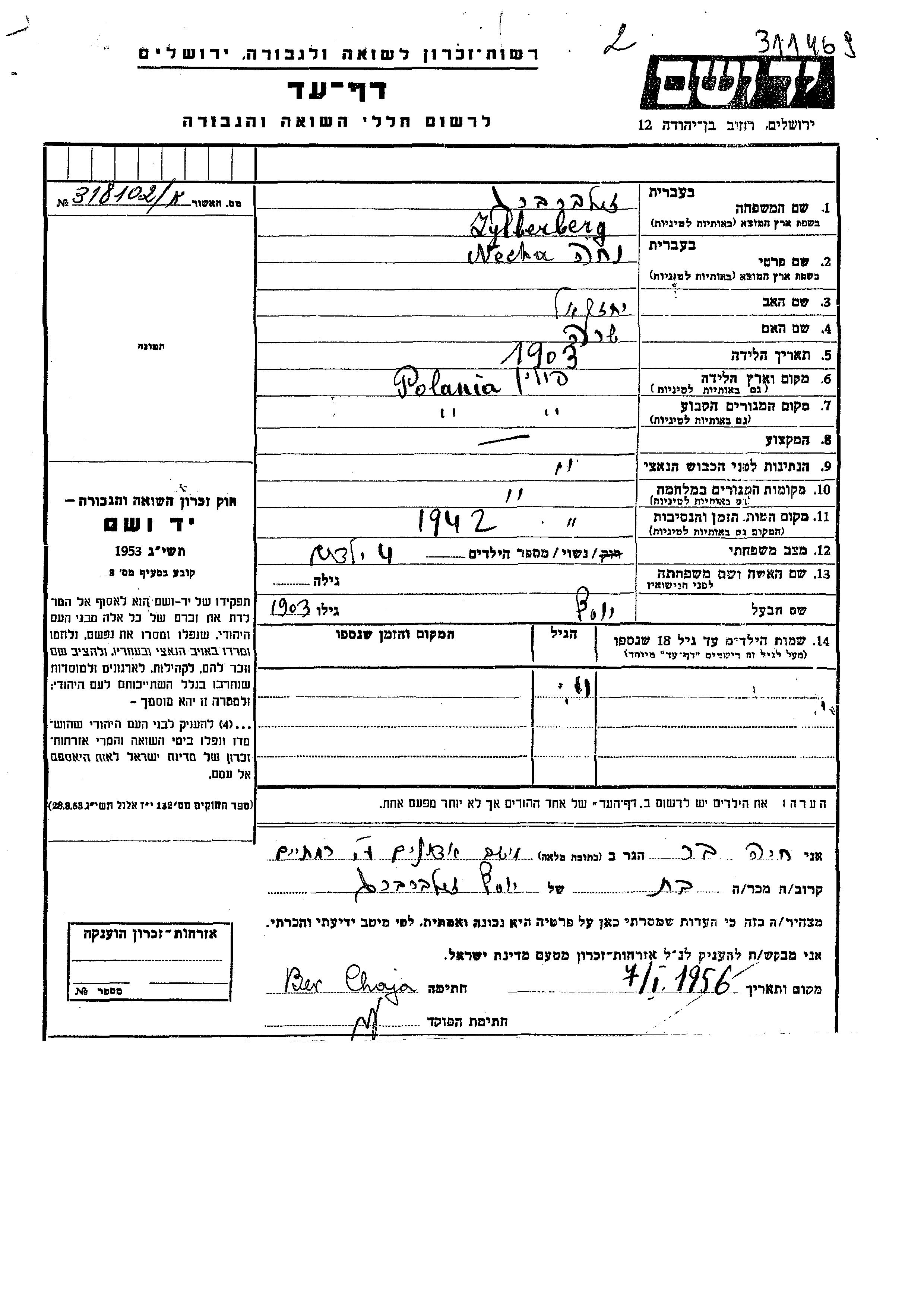 Zylberberg prénom inconnu Pologne Feuille de témoignage