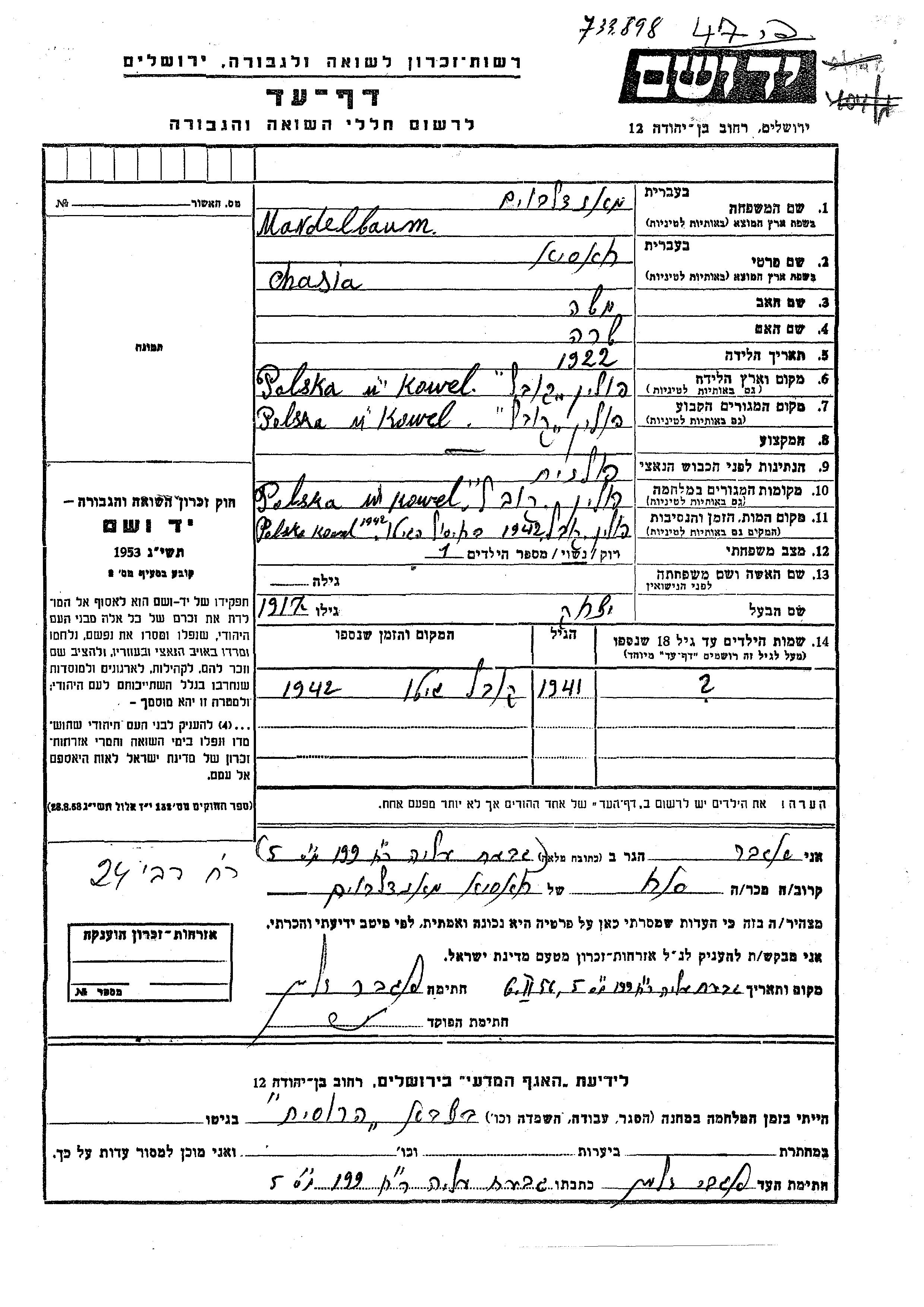 Mandelbaum prénom inconnu 1941 Kowel, Pologne Feuille de témoignage